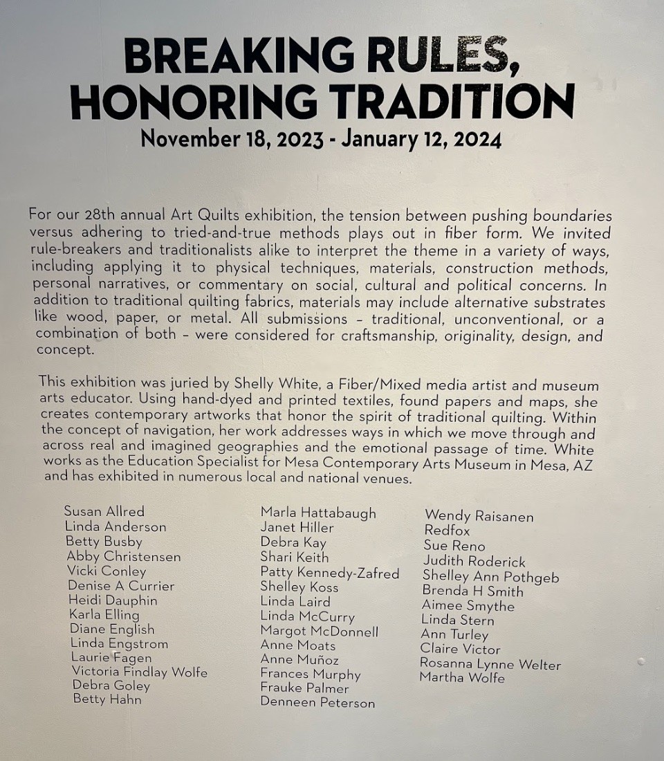 About the Breaking Rules, Honoring Tradition Exhibit: "For our 28th annual Art Quilt exhibition, the tension between pushing boundaries versus adhering to tried-and-true methods plays out in fiber form. We invited rule-breakers and traditionalists alike to interpret the theme in a variety of ways, including applying it to physical techniques, materials, construction methods, personal narratives, or commentary on social, cultural and political concerns. In addition to traditional quilting fabrics, materials may include alternative substrates like wood, paper, or metal. All submissions - traditional, unconventional, or a combination of both - were considered for craftsmanship, originality, design, and concept."