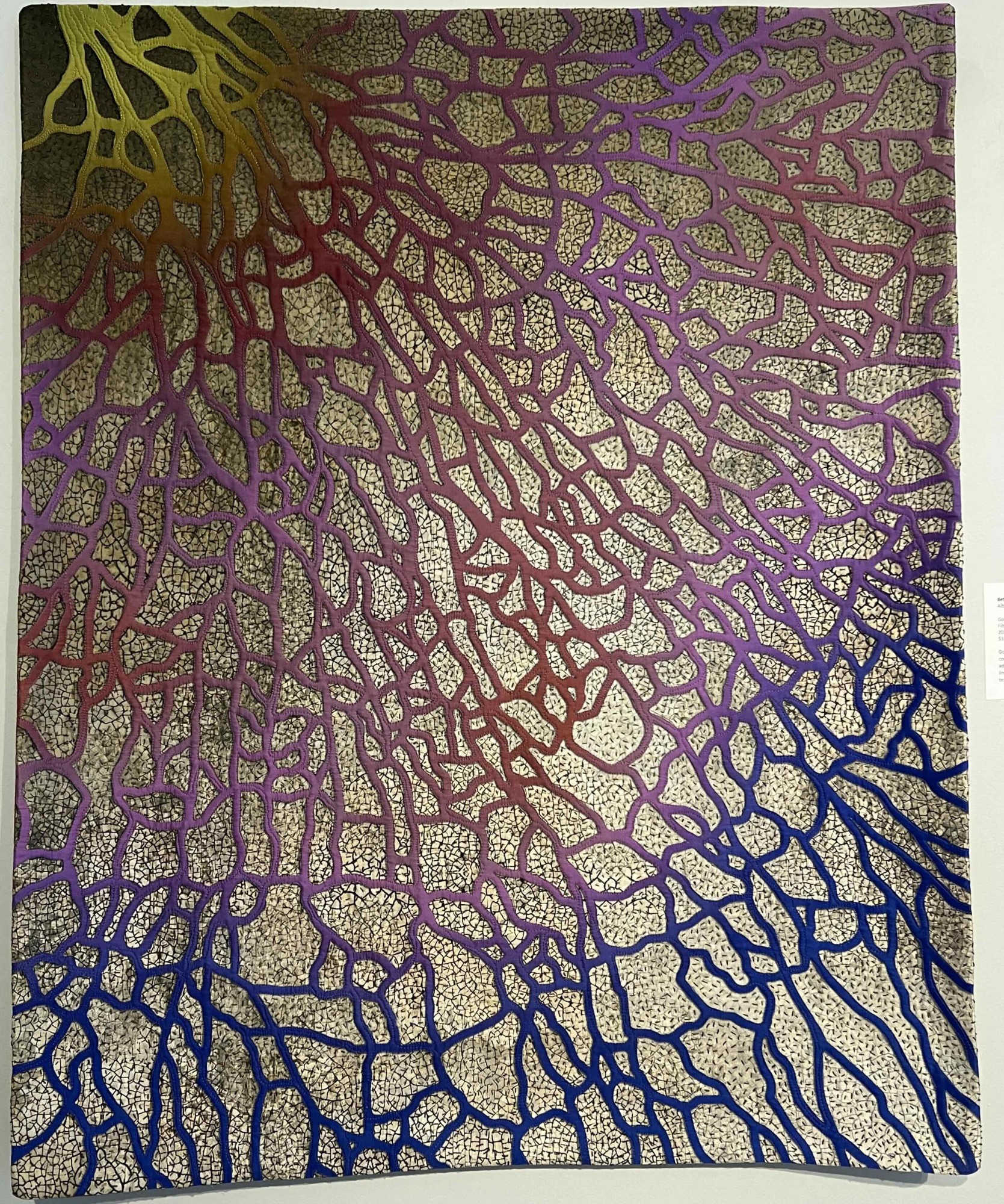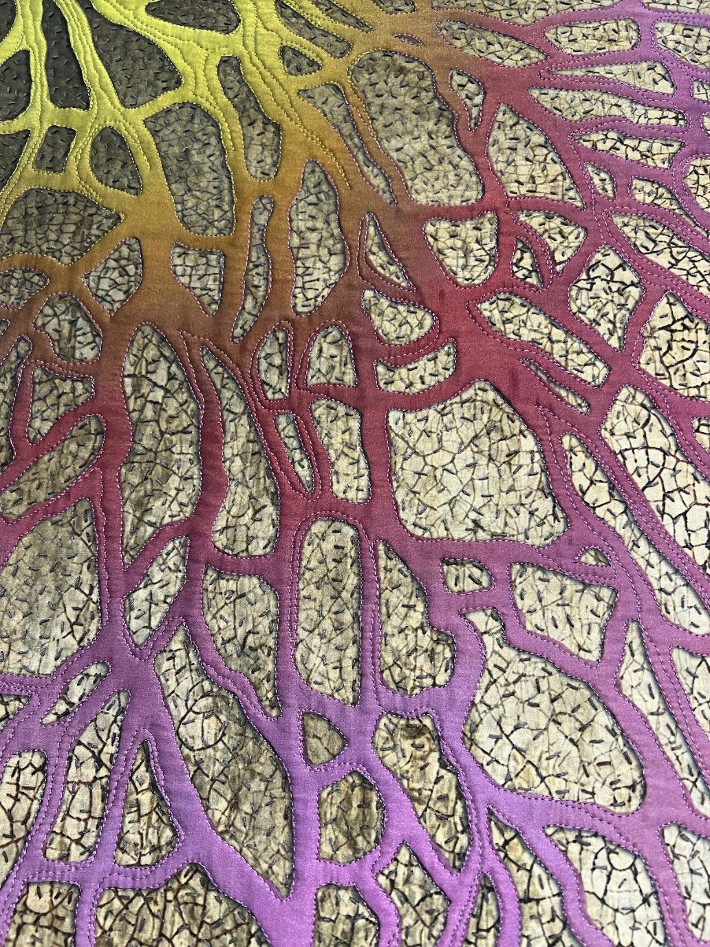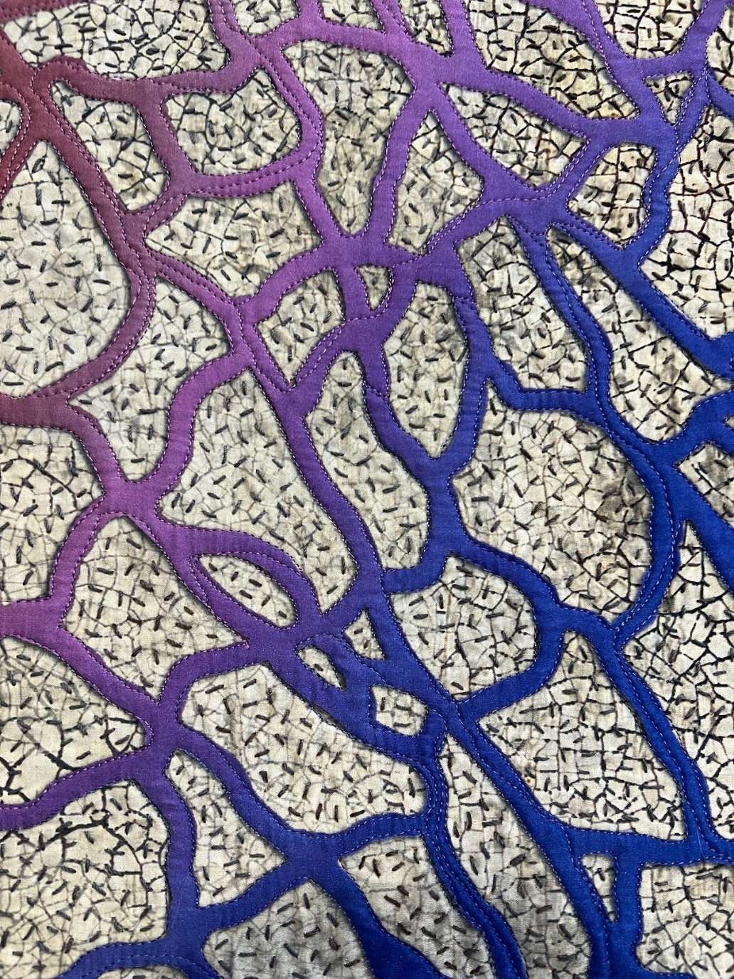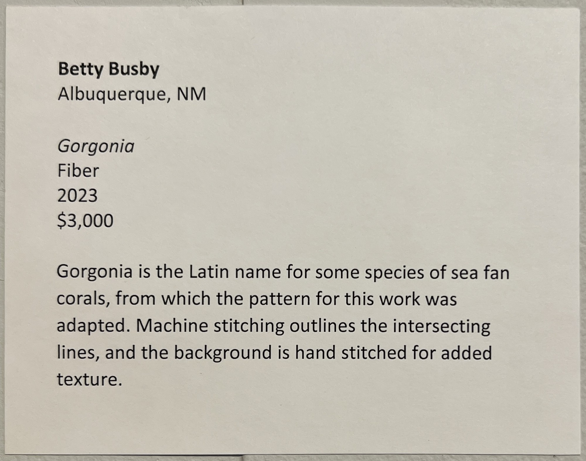 Artist Statement: "Gorgonia is the Latin name for some species of sea fan corals, from which the pattern for this work was adapted. Machine stitching outlines the intersecting lines, and the background is hand stitched for added texture."