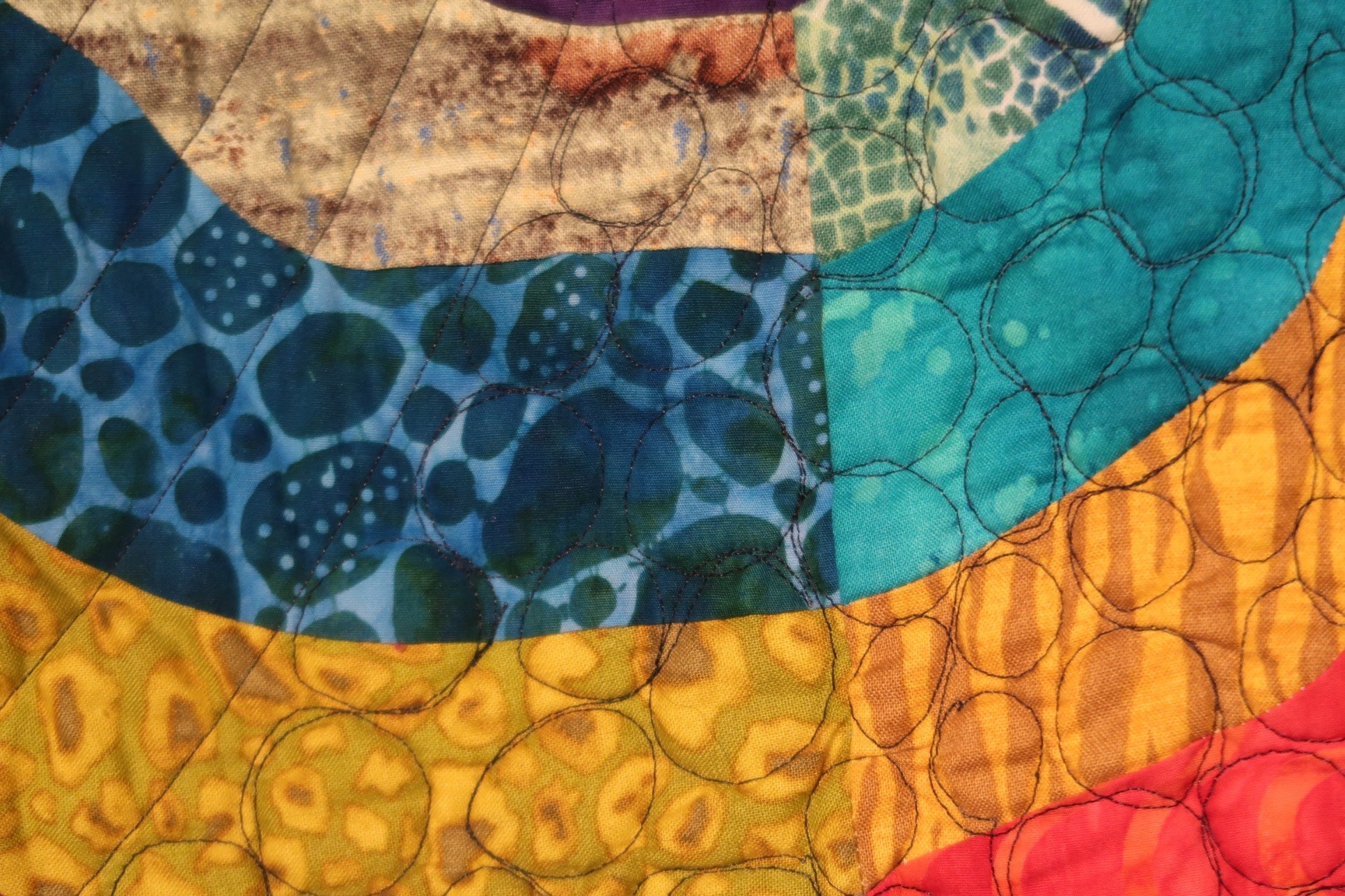 "Inside Out" features circles that Karla created using quarter arcs. For this quilt in particular, she wanted to go high-contrast with the colors, and have the circles end up being wobbly. However, even though the circles were wobbly, she wanted the edges to match, because a lot of the time the seams don't match when you free-form create arcs and circles.