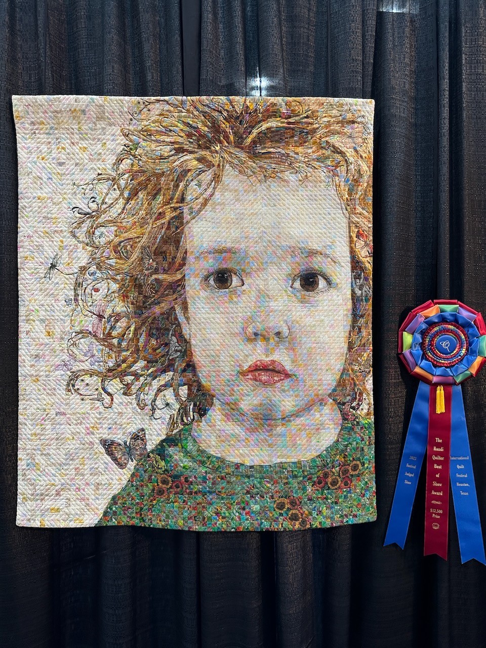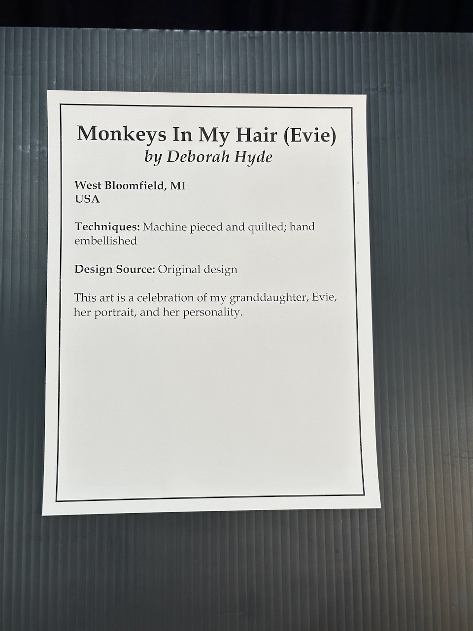 "Monkeys in My Hair (Evie)" by Deborah S. Hyde won the Handi Quilter Best of Show award at Houston 2023.