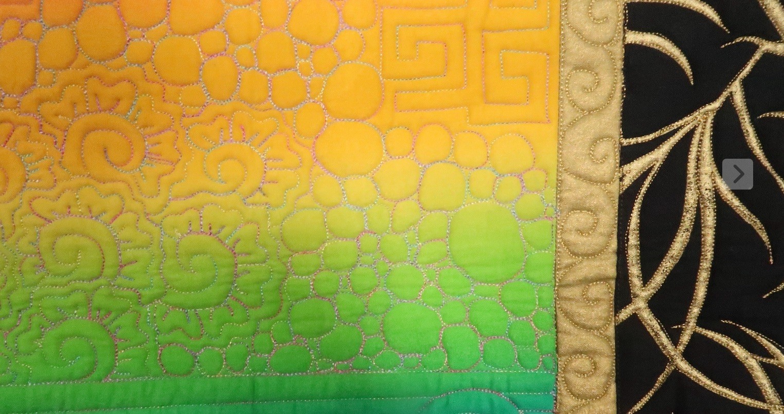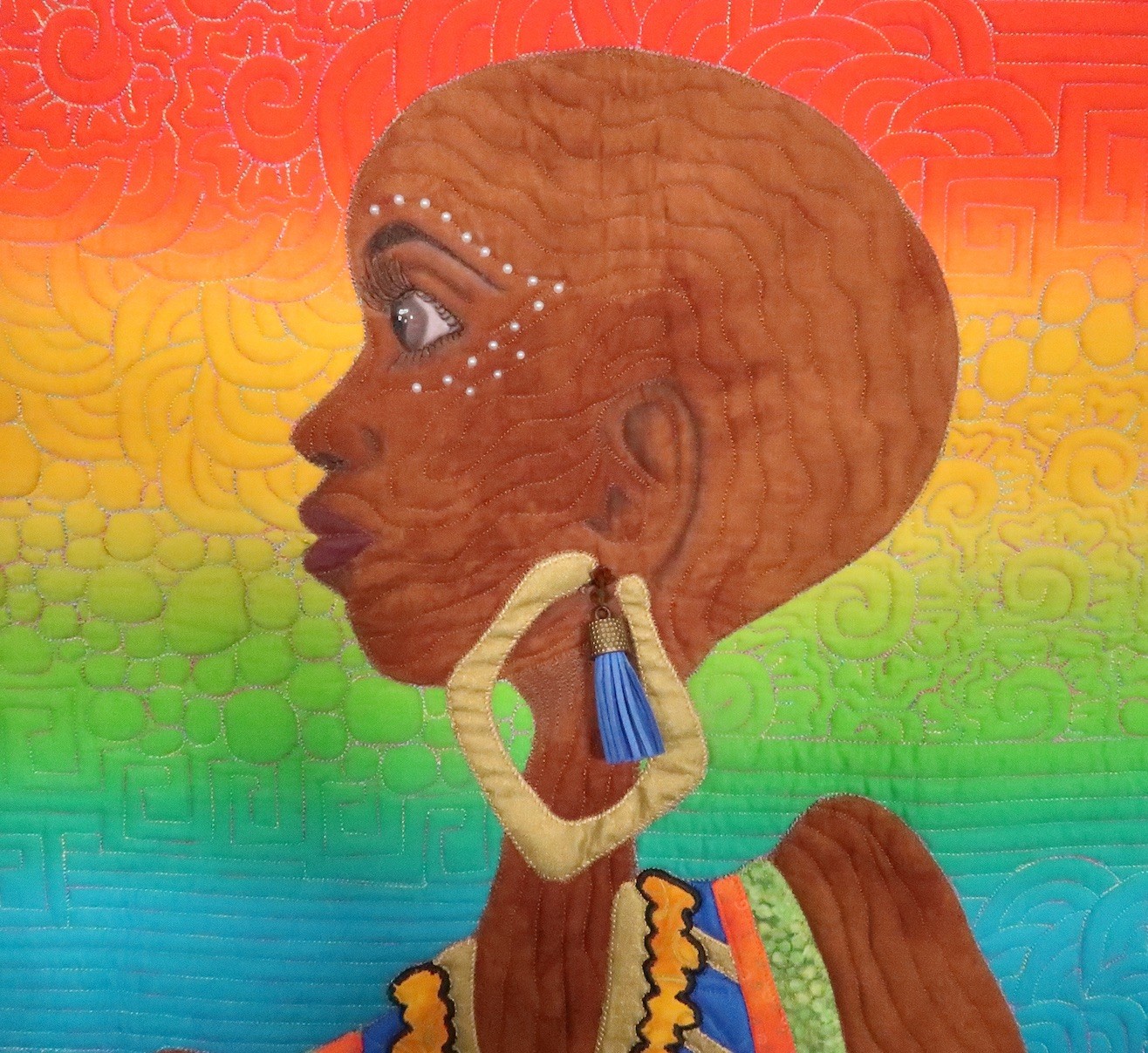 In Renée's show she brought to the set a number of warrior women. The beautiful colors and amount of different types of background quilting in this example, help to reinforce this warrior woman's inner strength.