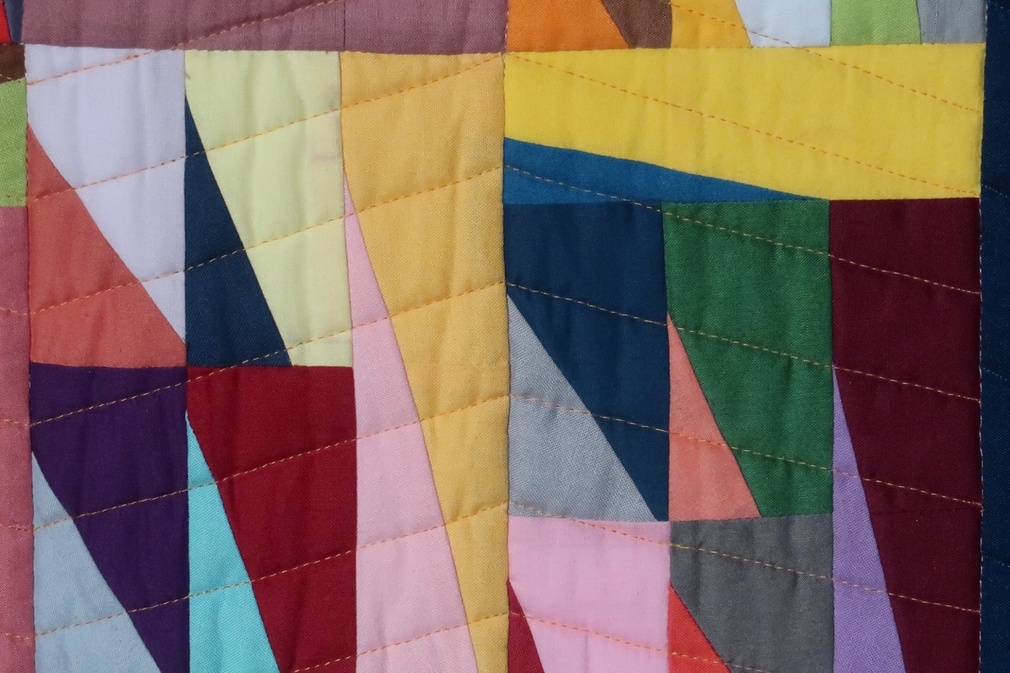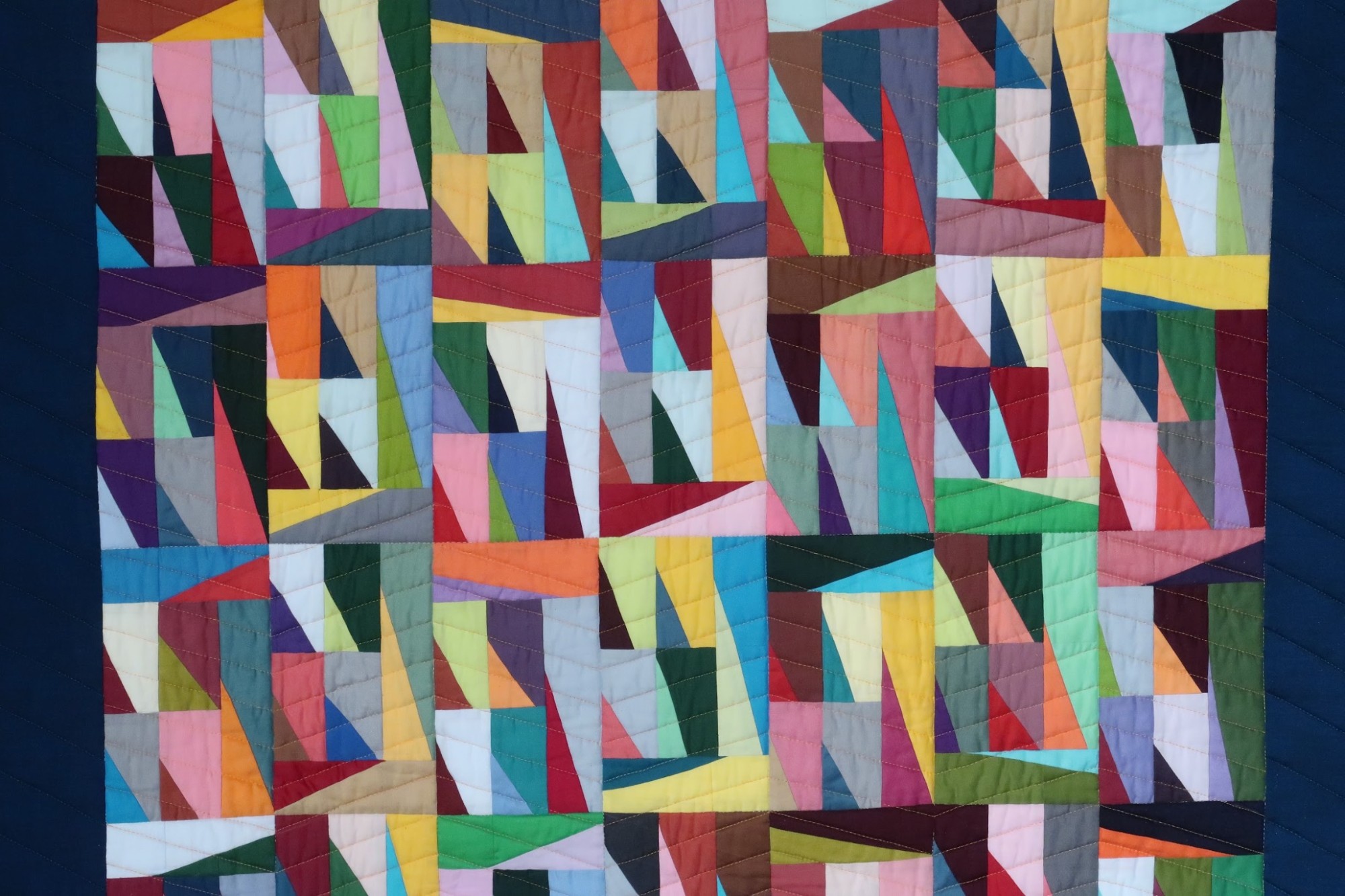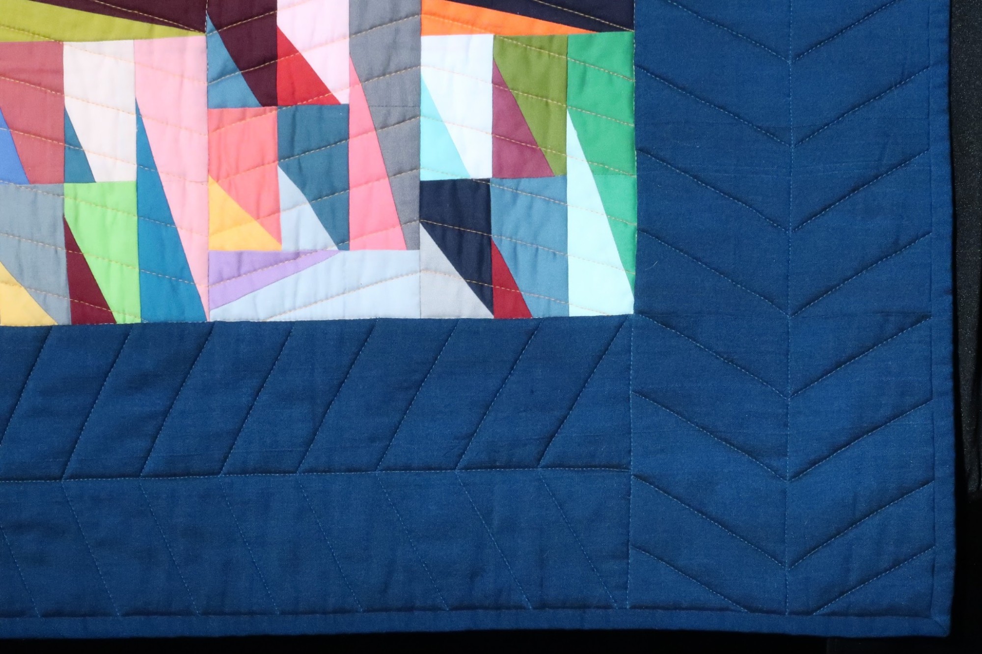 Marge had taken classes and workshops from Gwen, and the fabric pieces used in the center of Ode to Gwen JOY Marston are from a box of rectangles that Gwen sent to her. Marge saved those pieces for a long time, knowing they were meant for a special project. When she learned that Gwen had passed in April 2019, Marge remembered that box and began to cut those rectangles into improvisational triangles, which was a technique Gwen showed her how to do, and began to make this quilt.