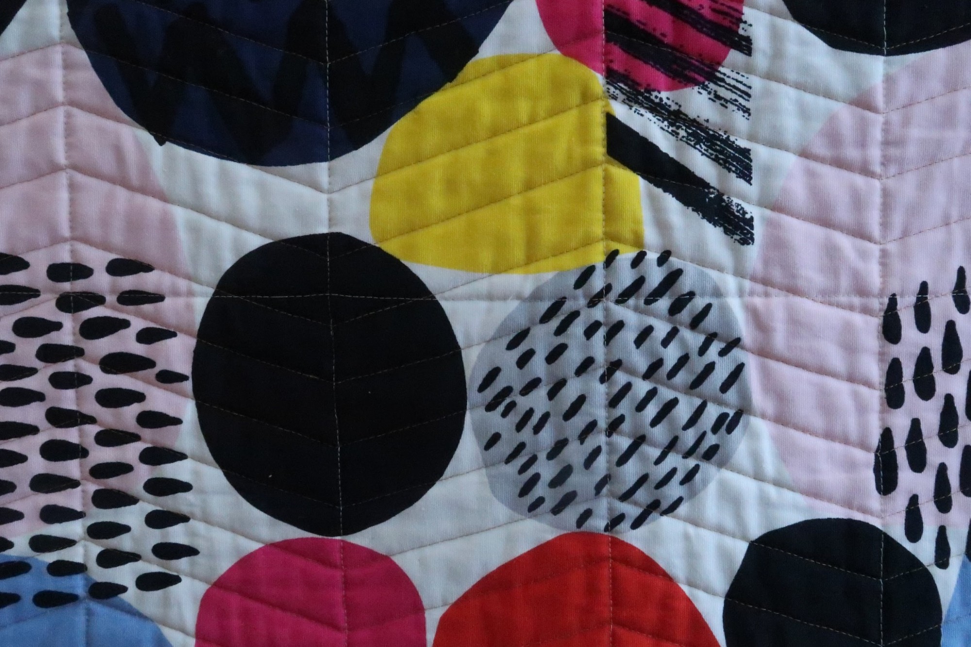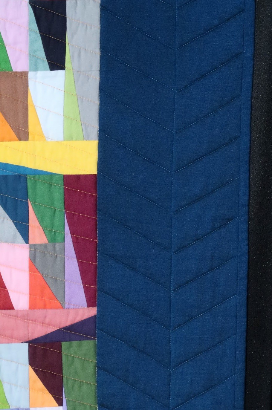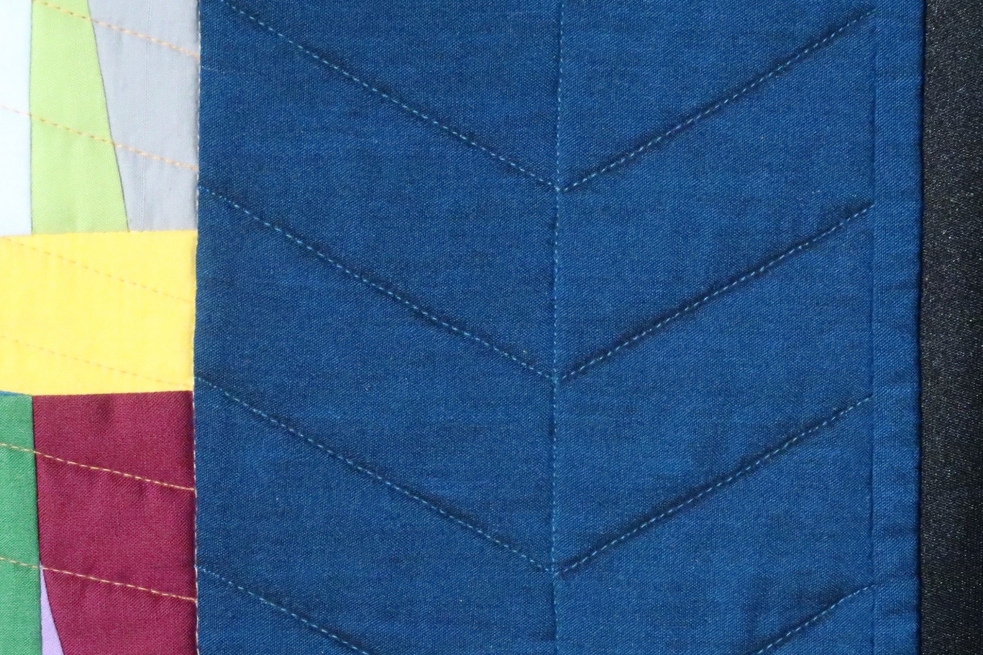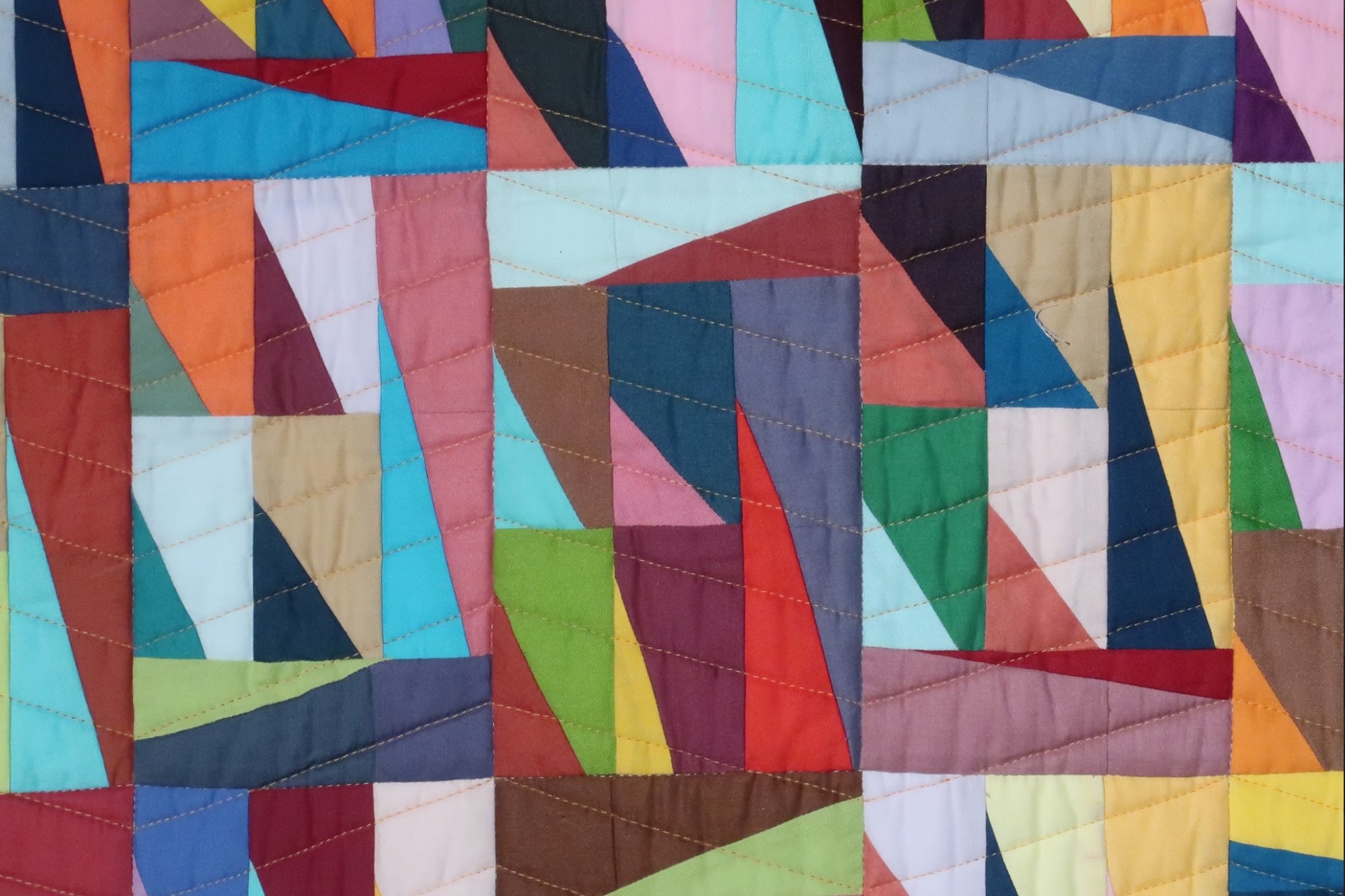 Marge had taken classes and workshops from Gwen, and the fabric pieces used in the center of Ode to Gwen JOY Marston are from a box of rectangles that Gwen sent to her. Marge saved those pieces for a long time, knowing they were meant for a special project. When she learned that Gwen had passed in April 2019, Marge remembered that box and began to cut those rectangles into improvisational triangles, which was a technique Gwen showed her how to do, and began to make this quilt.