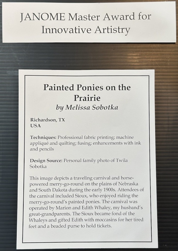 Artist Statement (Houston International Quilt Festival 2025): "This image depicts a traveling carnival and horse-powered merry-go-round on the plains of Nebraska and South Dakota during the early 1900s. Attendees of the carnival included Sioux, who enjoyed riding the merry-go-round’s painted ponies. The carnival was operated by Marion and Edith Whaley, my husband’s great-grandparents. The Sioux became fond of the Whaleys and gifted Edith with moccasins for her tired feet and a beaded purse to hold tickets."