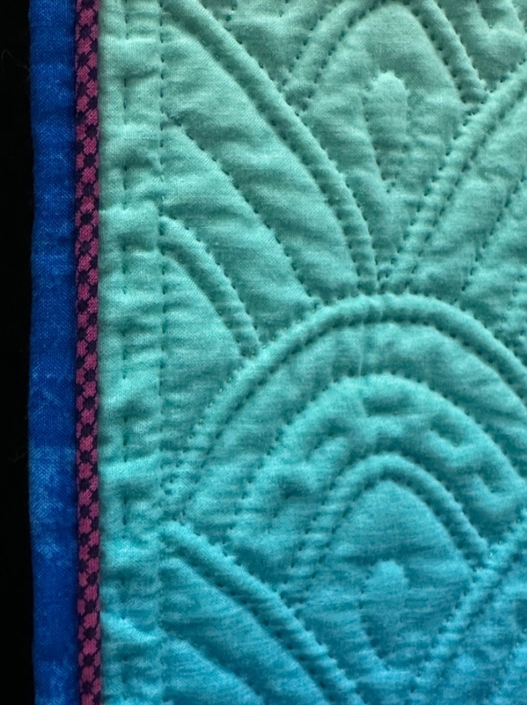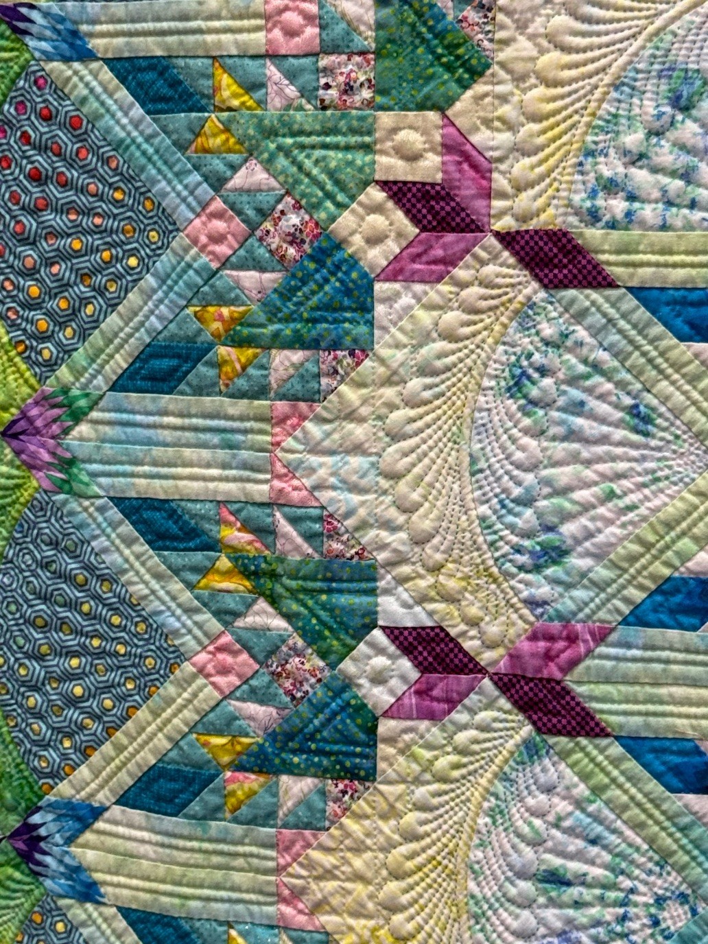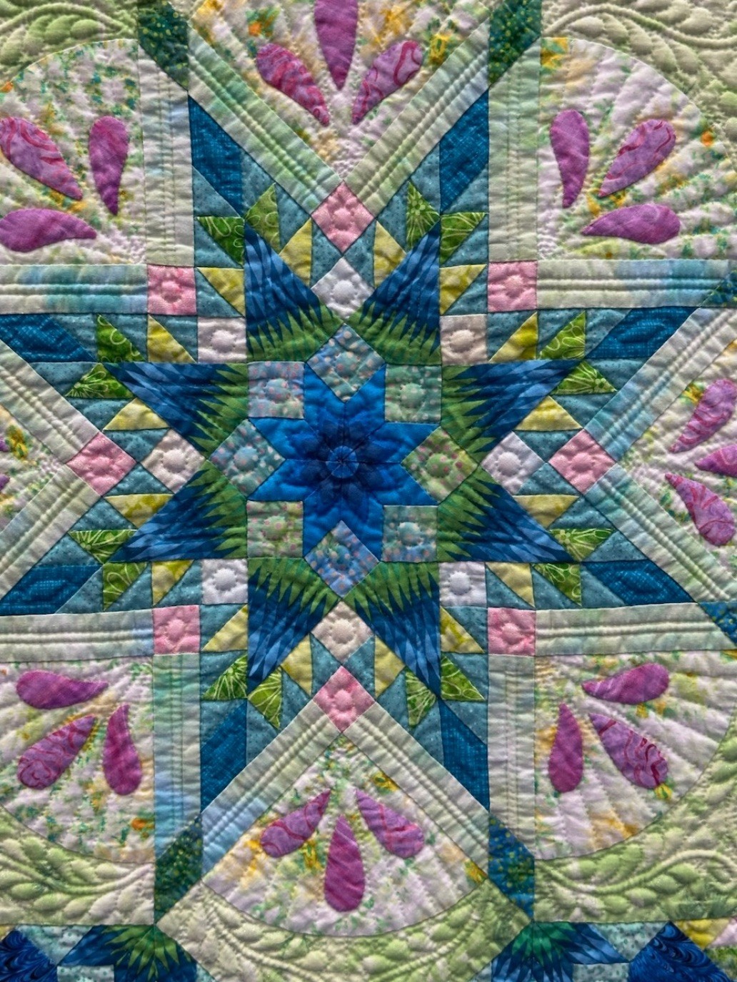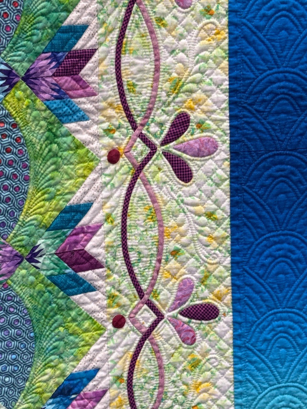 Artist Statement: "I can’t forget the beauty of a peacock feather I saw at my grandfather’s house as a child. I loved the color of the peacock’s feathers. This quilt was created with the image of a peacock spreading its wings. The quilting designs were also created with the image of its feathers. While I was making this quilt, beautiful colored fabrics made me happy."
