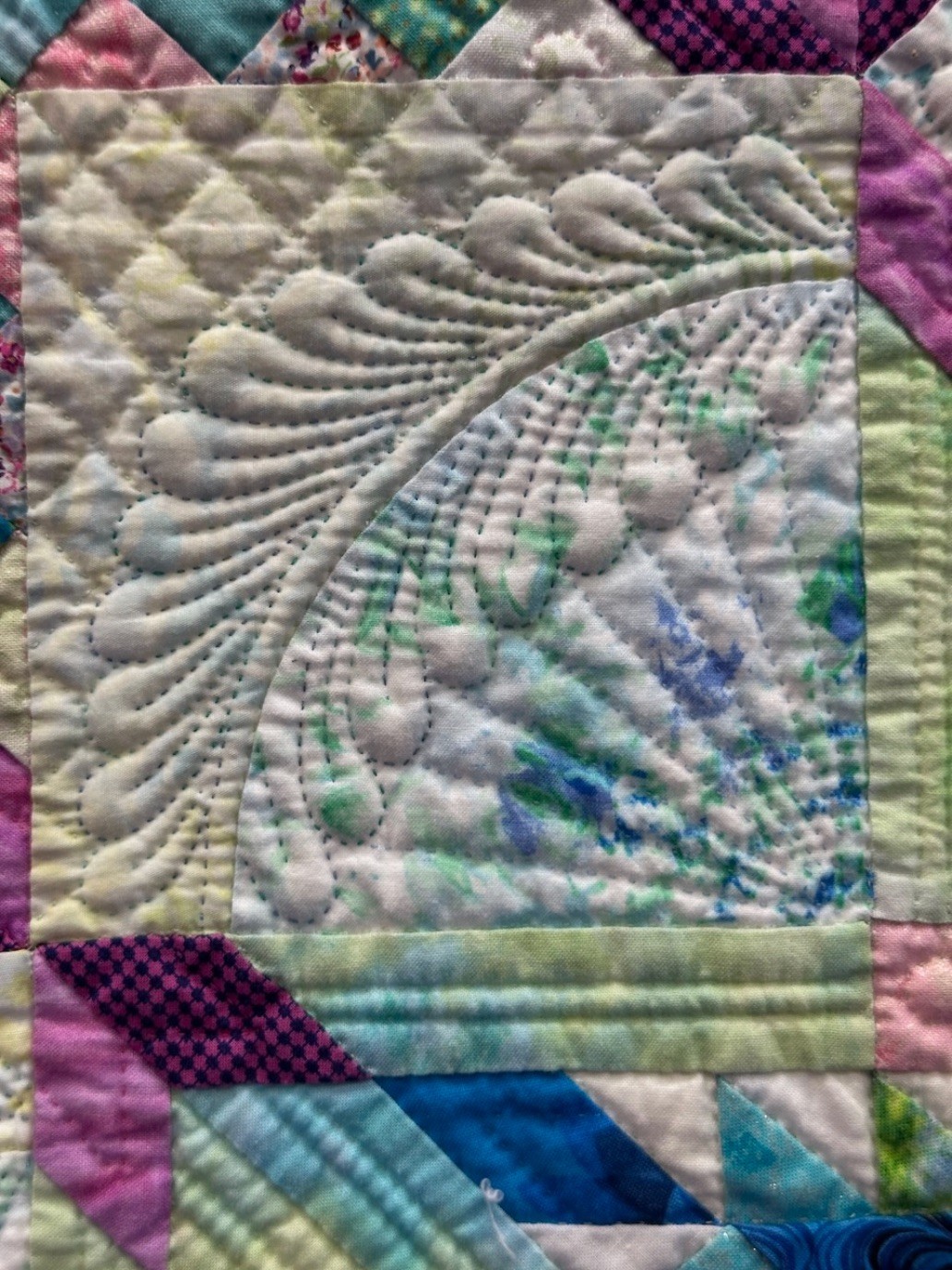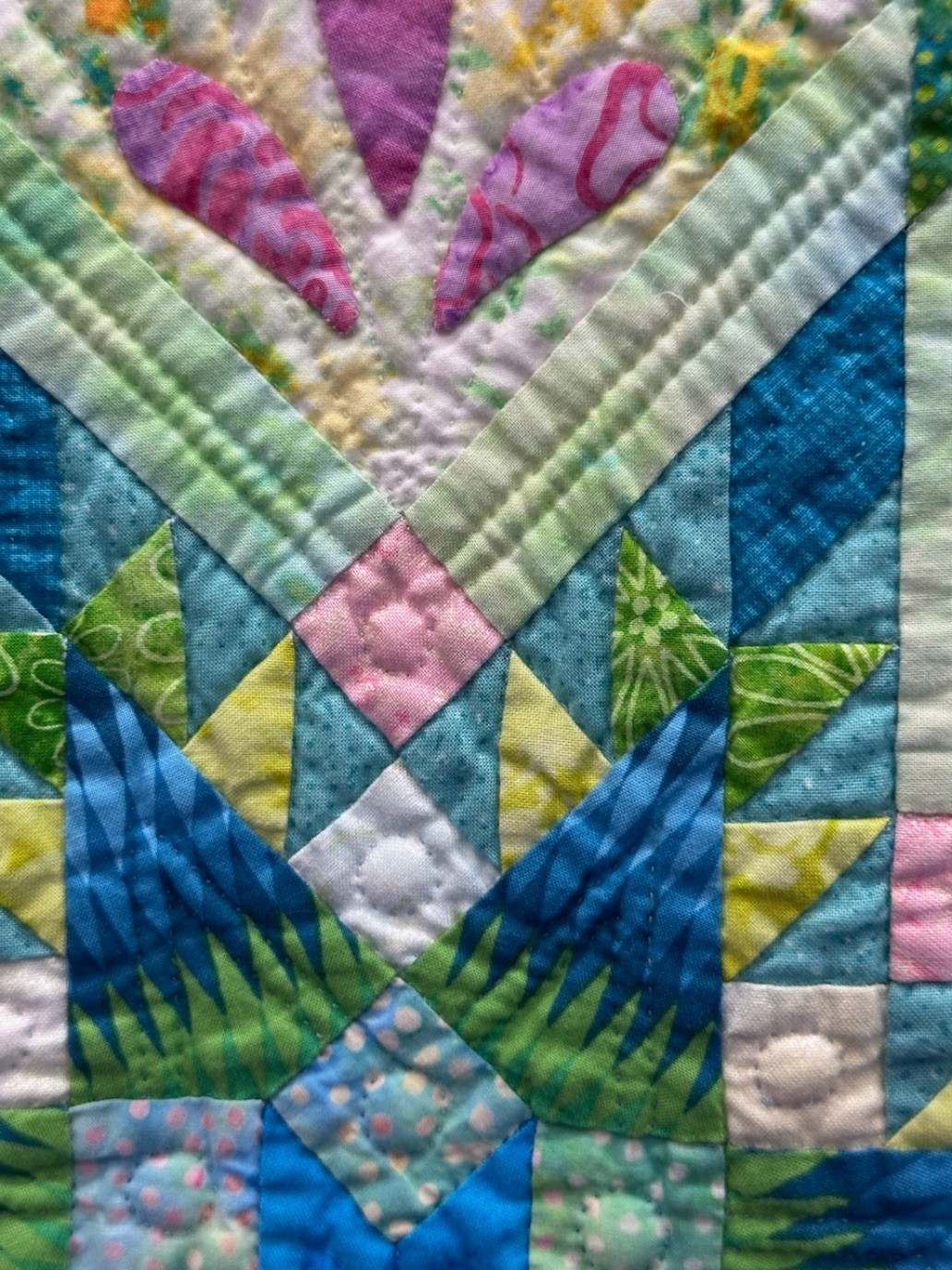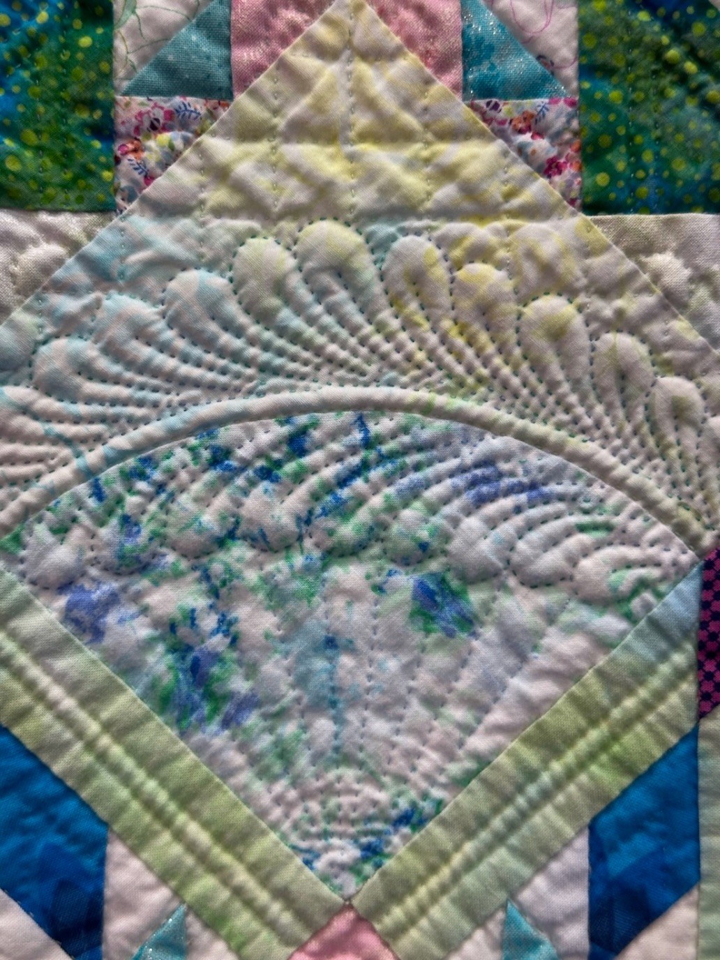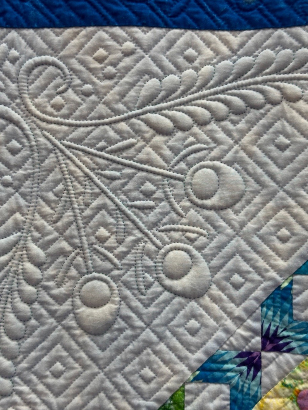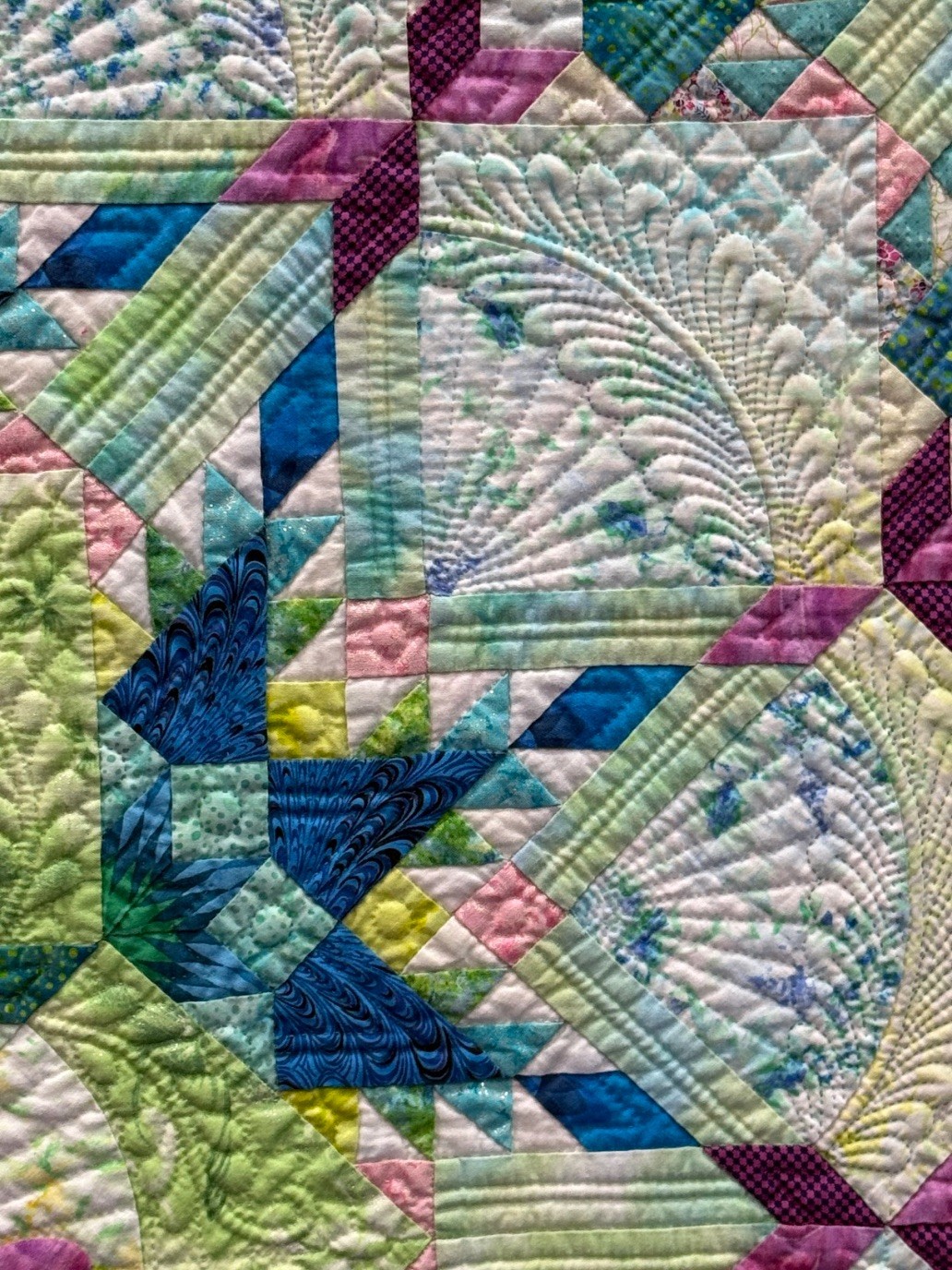 Artist Statement: "I can’t forget the beauty of a peacock feather I saw at my grandfather’s house as a child. I loved the color of the peacock’s feathers. This quilt was created with the image of a peacock spreading its wings. The quilting designs were also created with the image of its feathers. While I was making this quilt, beautiful colored fabrics made me happy."