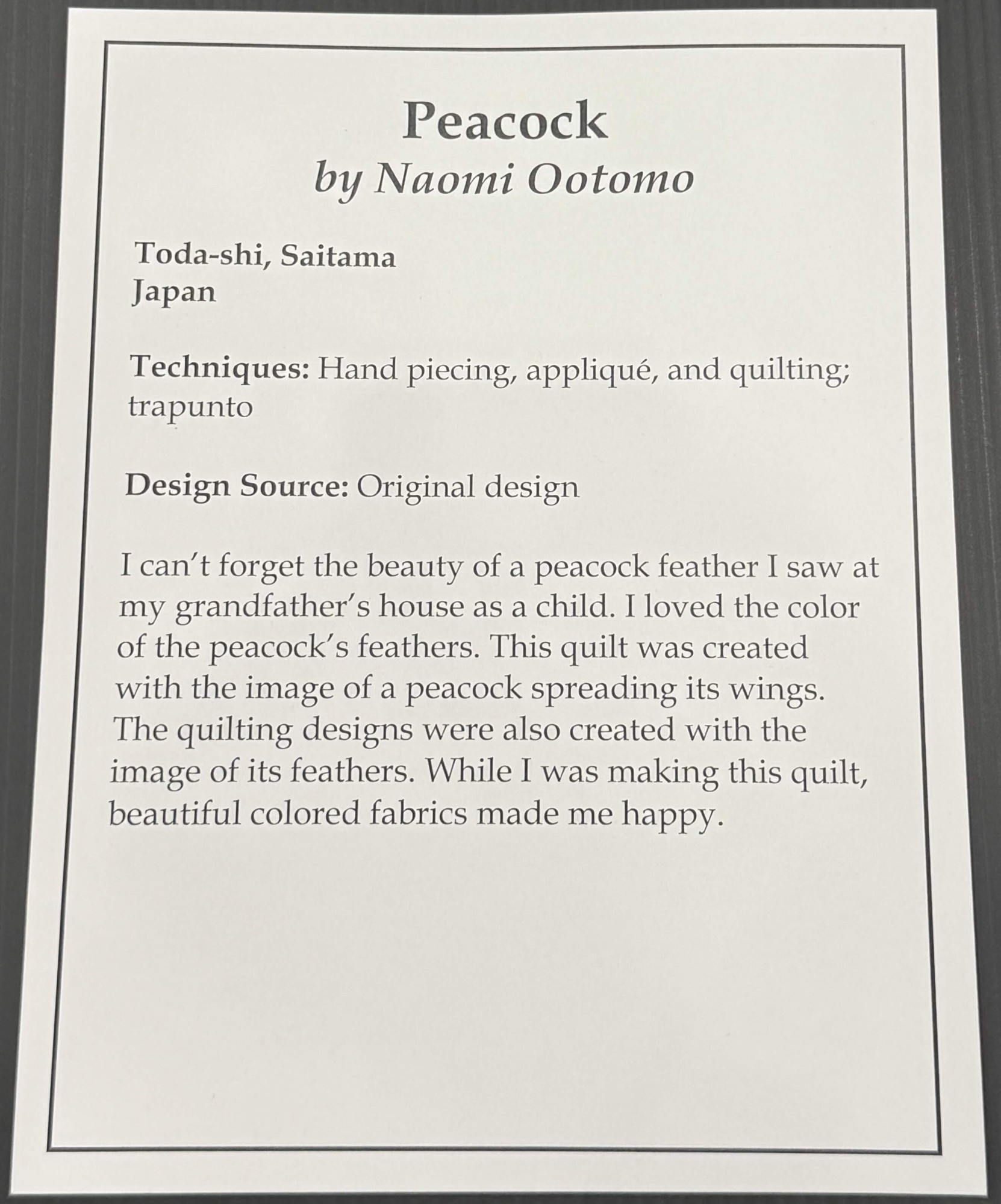"Peacock" by Naomi Otomo won Third Place - Handmade at Houston 2025.