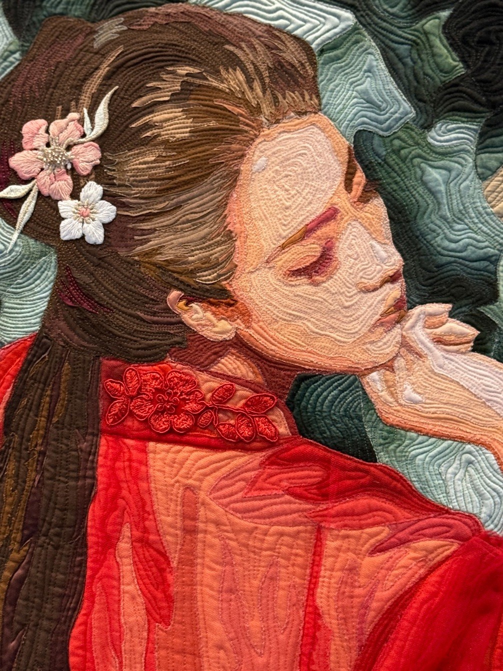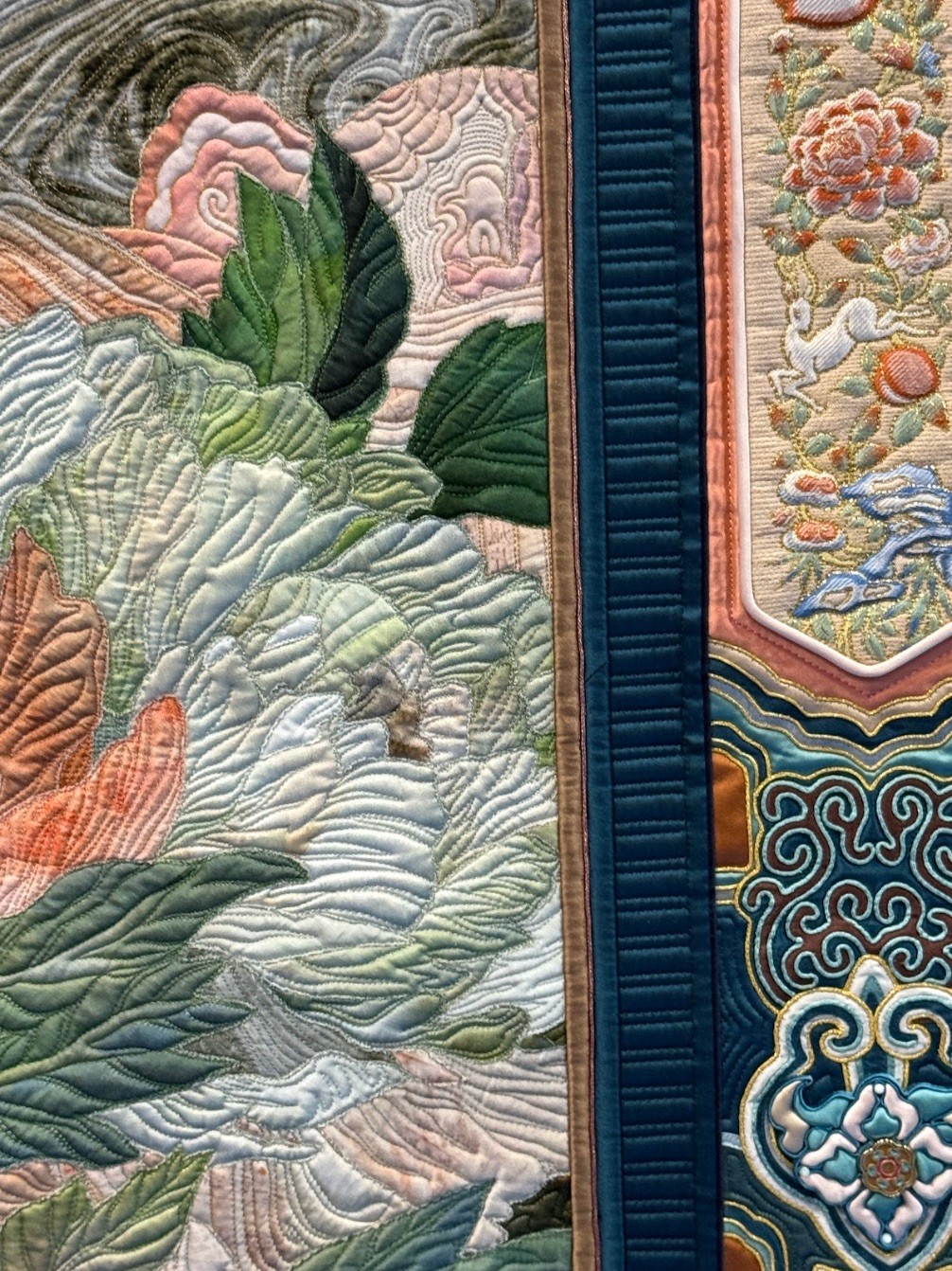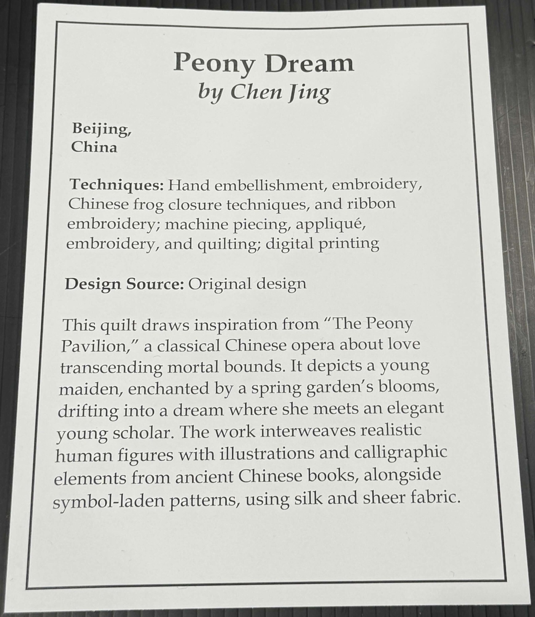 Artist Statement: "This quilt draws inspiration from "The Peony Pavilion," a classical Chinese opera about love transcending mortal bounds. It depicts a young maiden, enchanted by a spring garden’s blooms, drifting into a dream where she meets an elegant young scholar. The work interweaves realistic human figures with illustrations and calligraphic elements from ancient Chinese books, alongside symbol-laden patterns, using silk and sheer fabric."