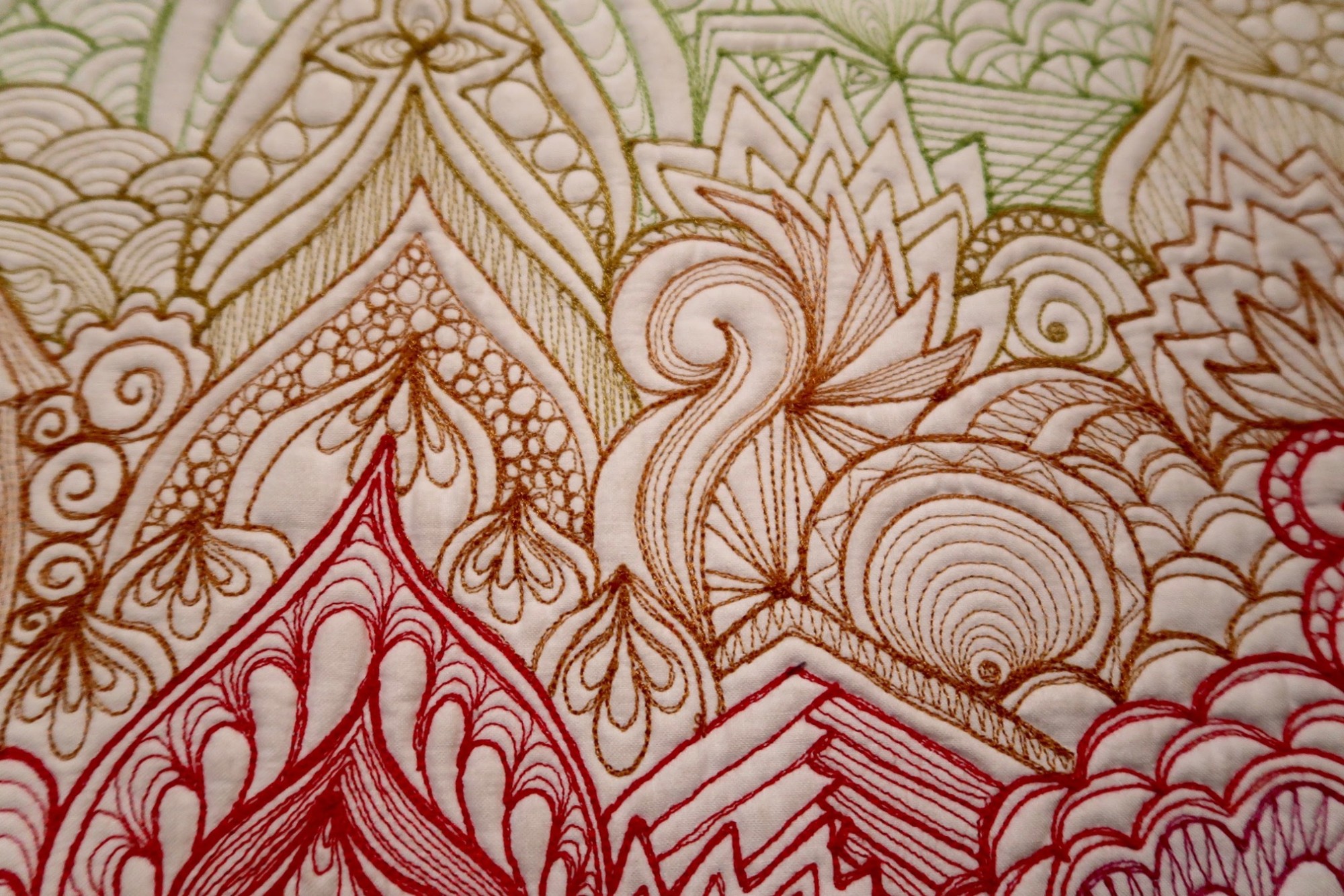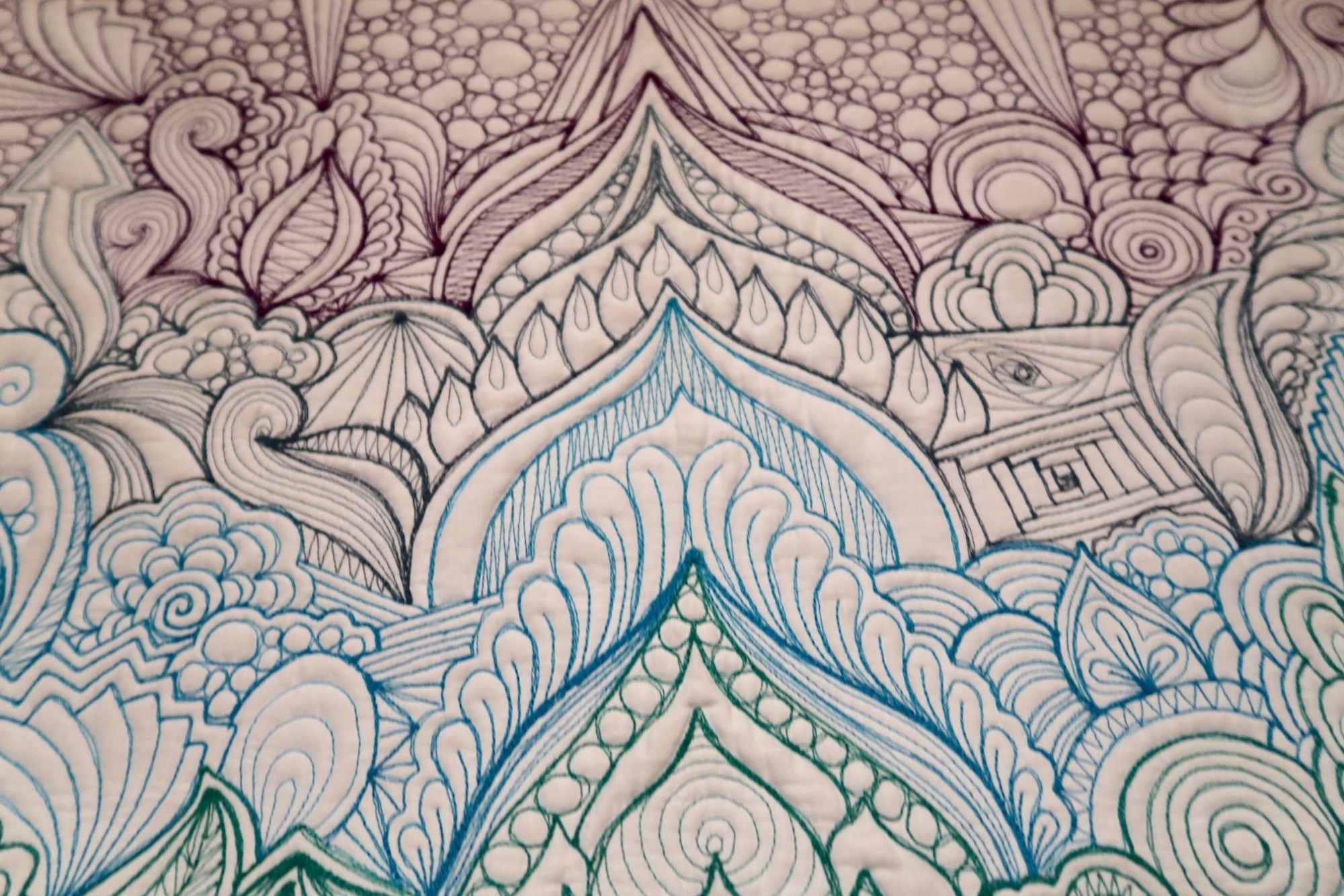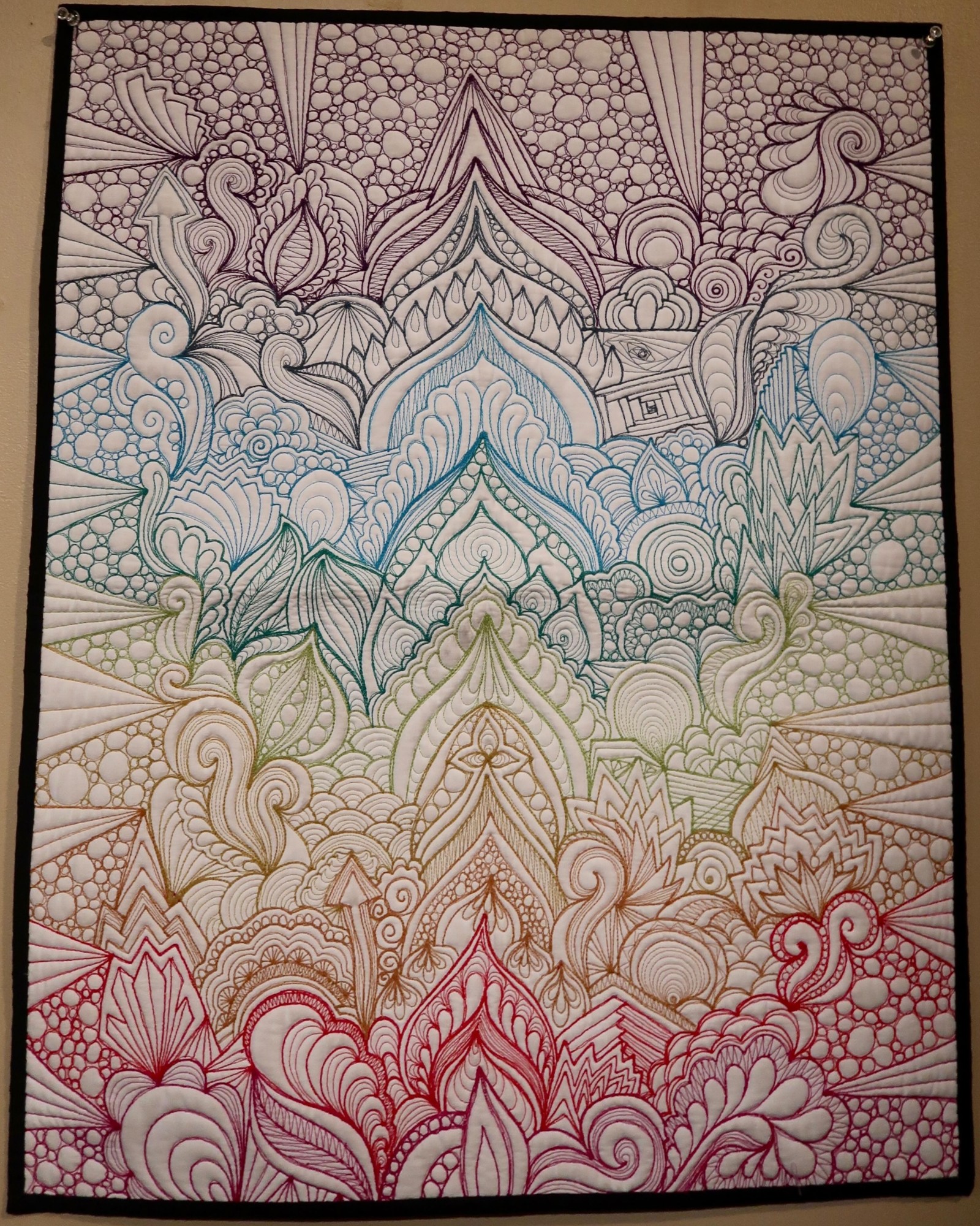 Karlee made Russian Mosque when she was just developing her Graffiti Quilting technique. She named it as such because the column of designs going up the center of the quilt reminded her of those historical, onion-topped buildings in Russia. This quilt is about 15″ x 22″, and packs quite a punch as far as thread count is concerned.