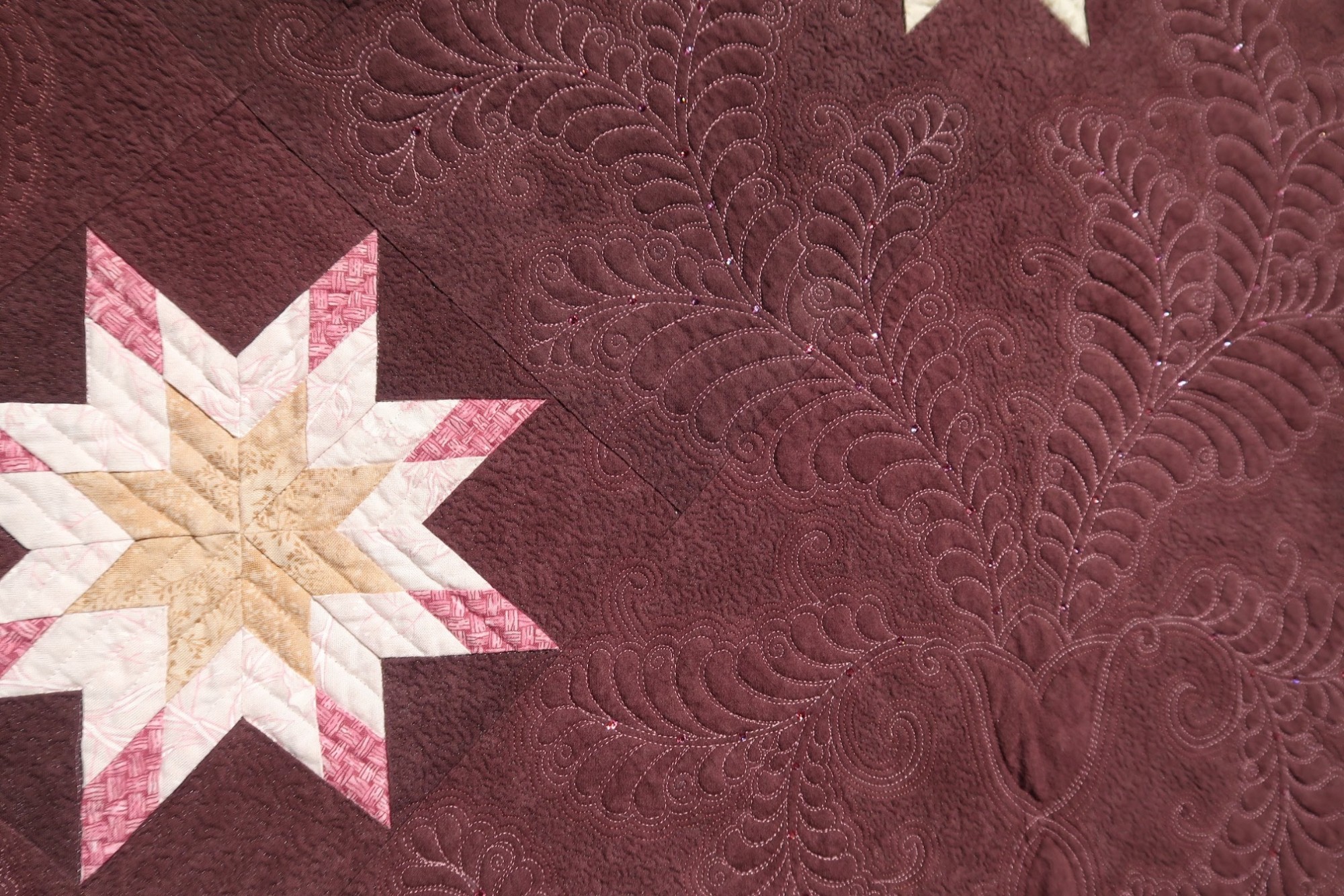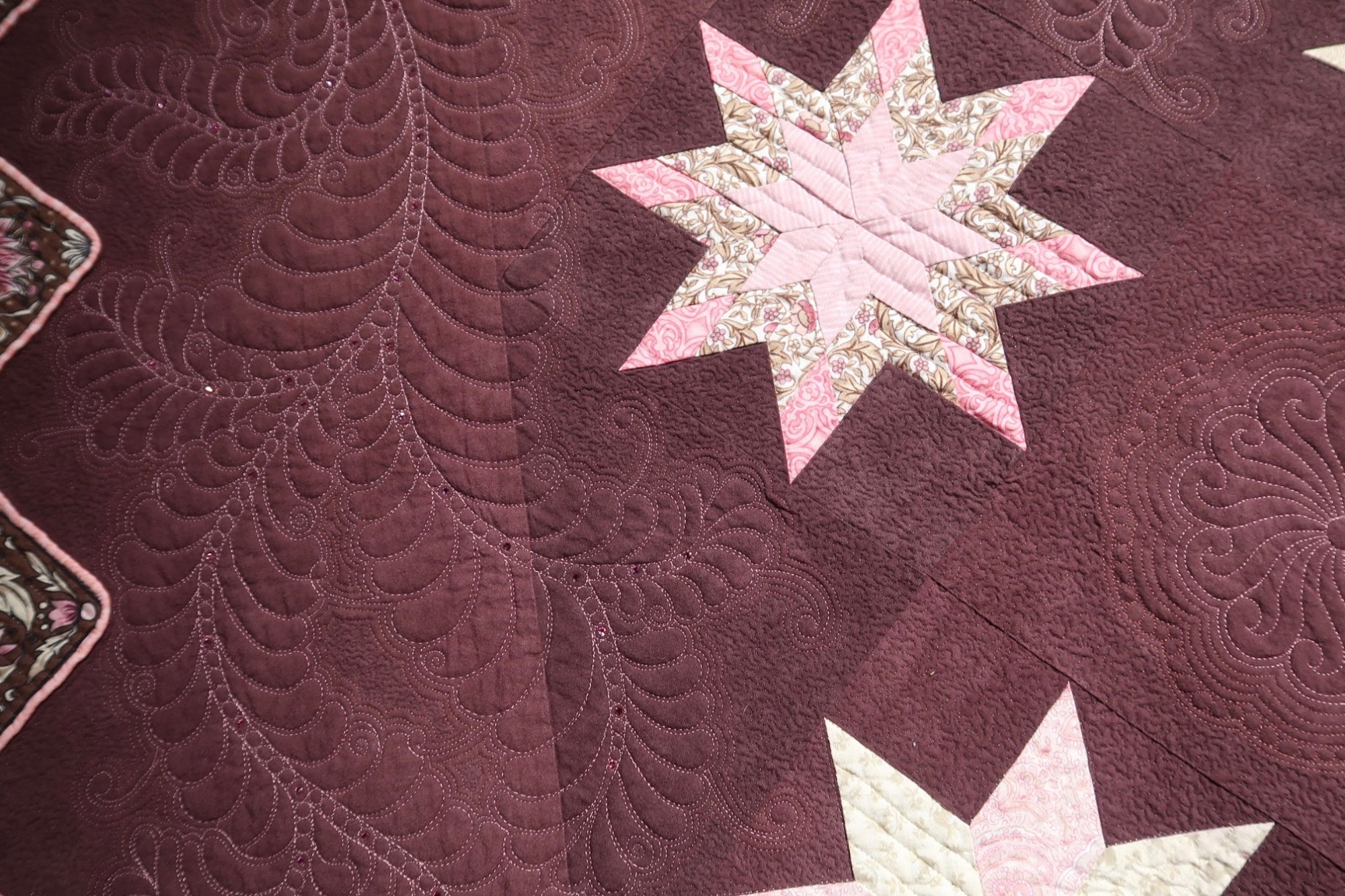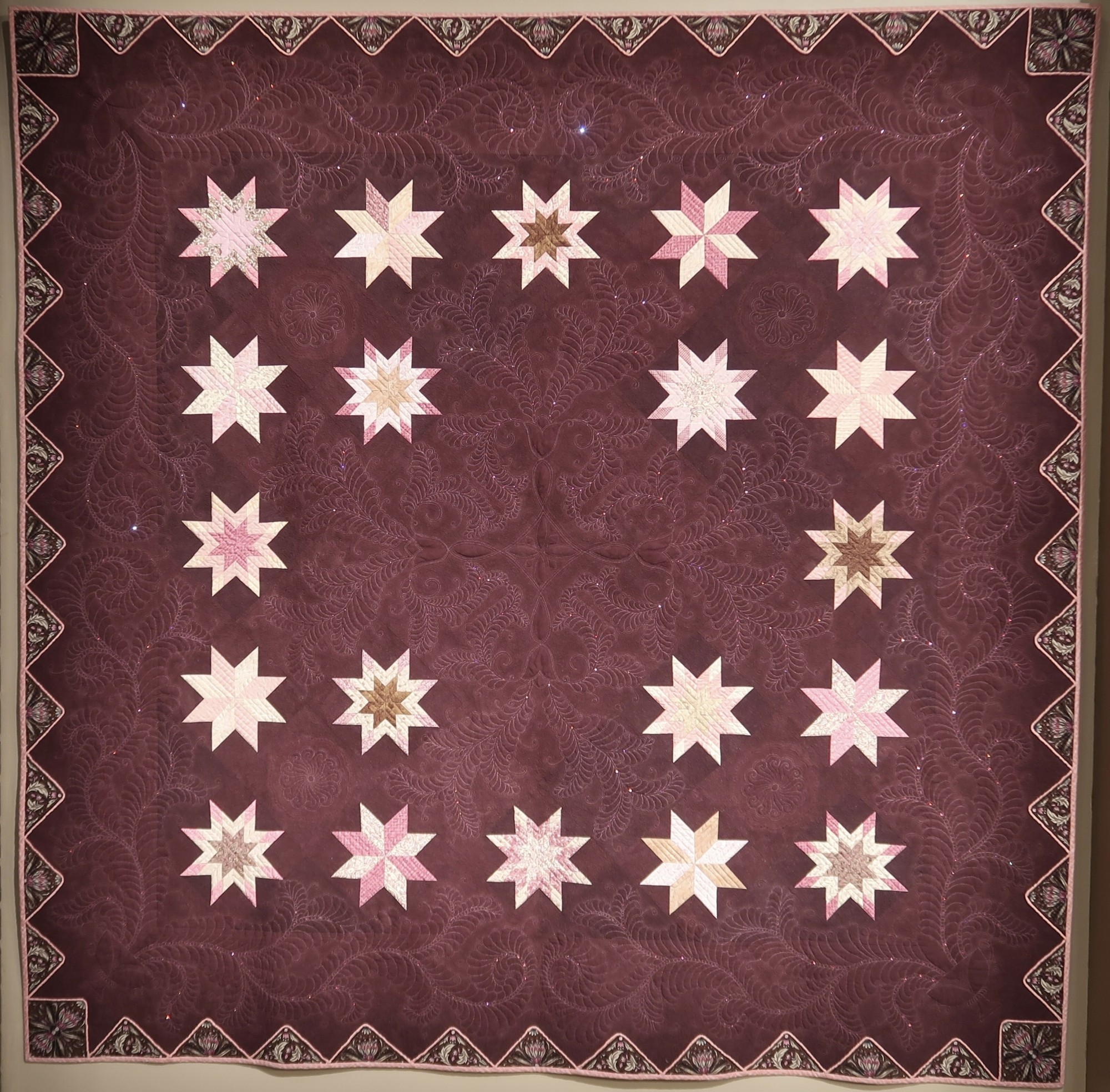 With each piece she does Cindy likes to leave a lot of area to quilt, so the simple LeMoyne stars that are laid out so precisely in this quilt are surrounded by fabulous machine quilting. That quilting has won Cindy numerous awards for Sweet Surrender, including Best Machine Workmanship at the American Quilter’s Society Quilt Show in Nashville, TN and Third Place - Merit Machine Quilting at the Houston International Quilt Festival.
