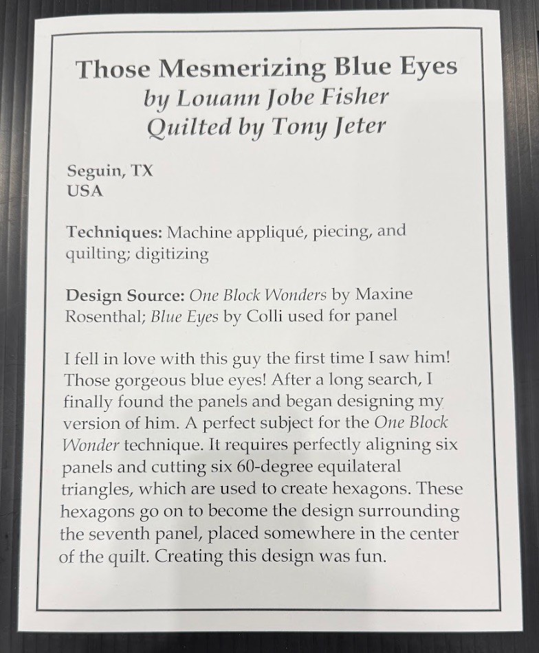 Louann Jobe Fisher writes about her quilt, Those Mesmerizing Blue Eyes, quilted by Tony Jeter, "I fell in love with this guy the first time I saw him! Those gorgeous blue eyes! After a long search, I finally found the panels and began designing my version of him. A perfect subject for the One Block Wonder technique. It requires perfectly aligning six panels and cutting six 60-degree equilateral triangles, which are used to create hexagons. These hexagons go on to become the design surrounding the seventh panel, placed somewhere in the center of the quilt. Creating this design was fun."