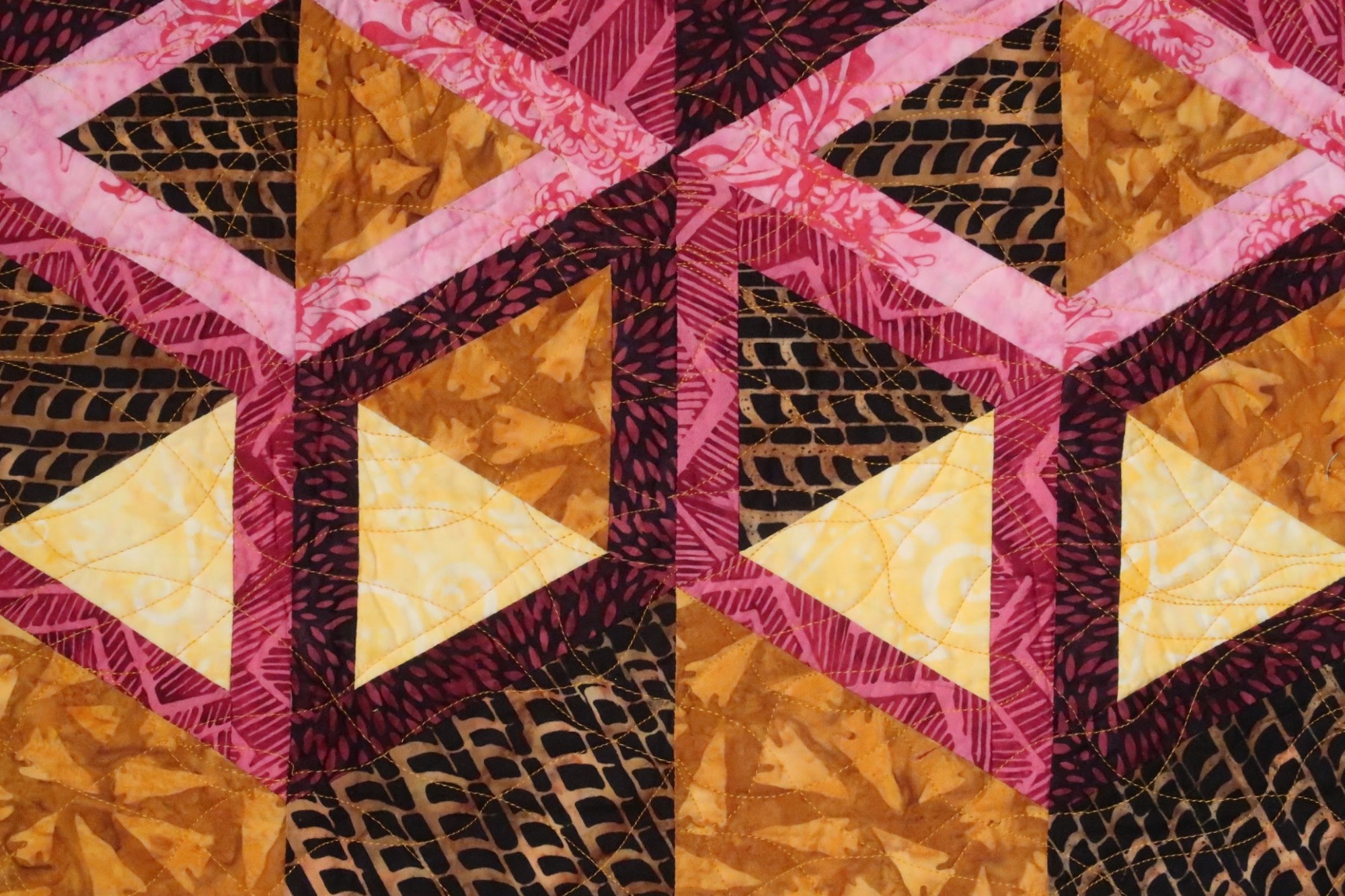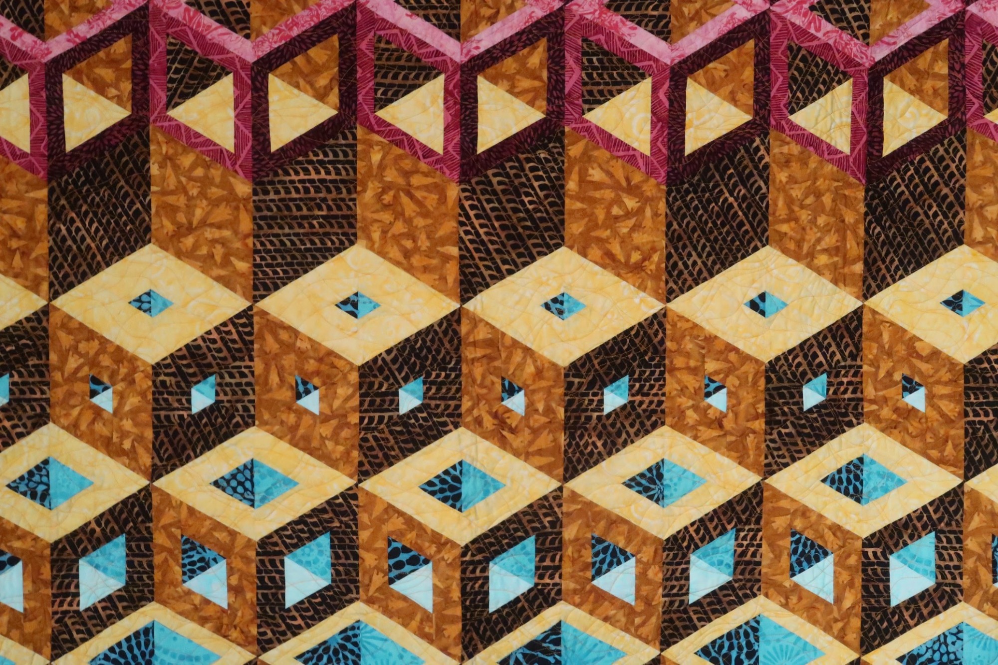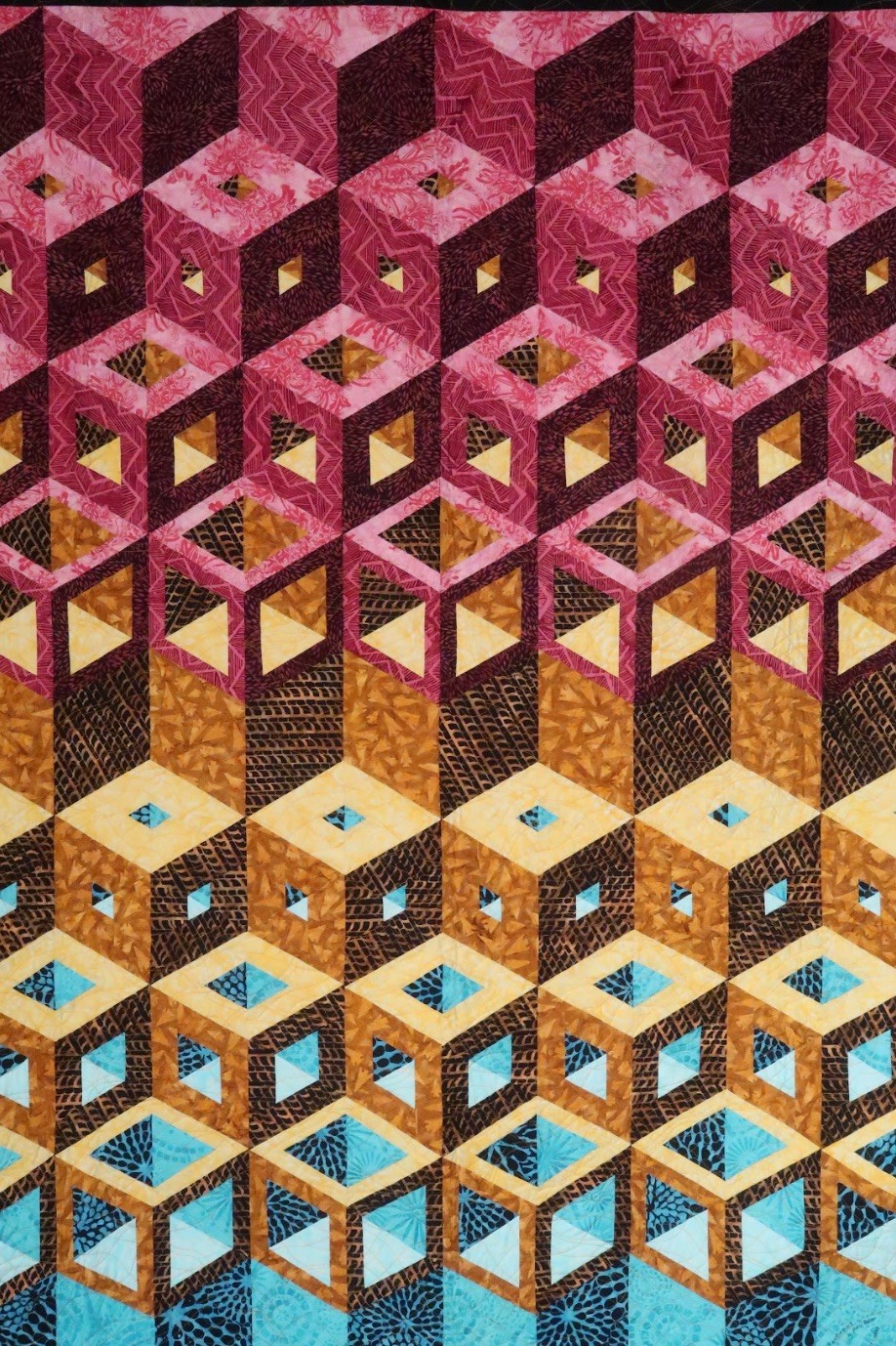 For Transitions, Marci worked with new blocks and sizes that her 3-D Magic! co-author Sara Nephew designed. The transitions of the title occur as the pink blocks at the top become the blue ones on the bottom, using light, medium, and dark variations of the different fabrics to create the 3-D vision. She and Sara call the top blocks "Peek-A-Boo", followed by a traditional block, and then the bottom ones are "I See You" blocks.