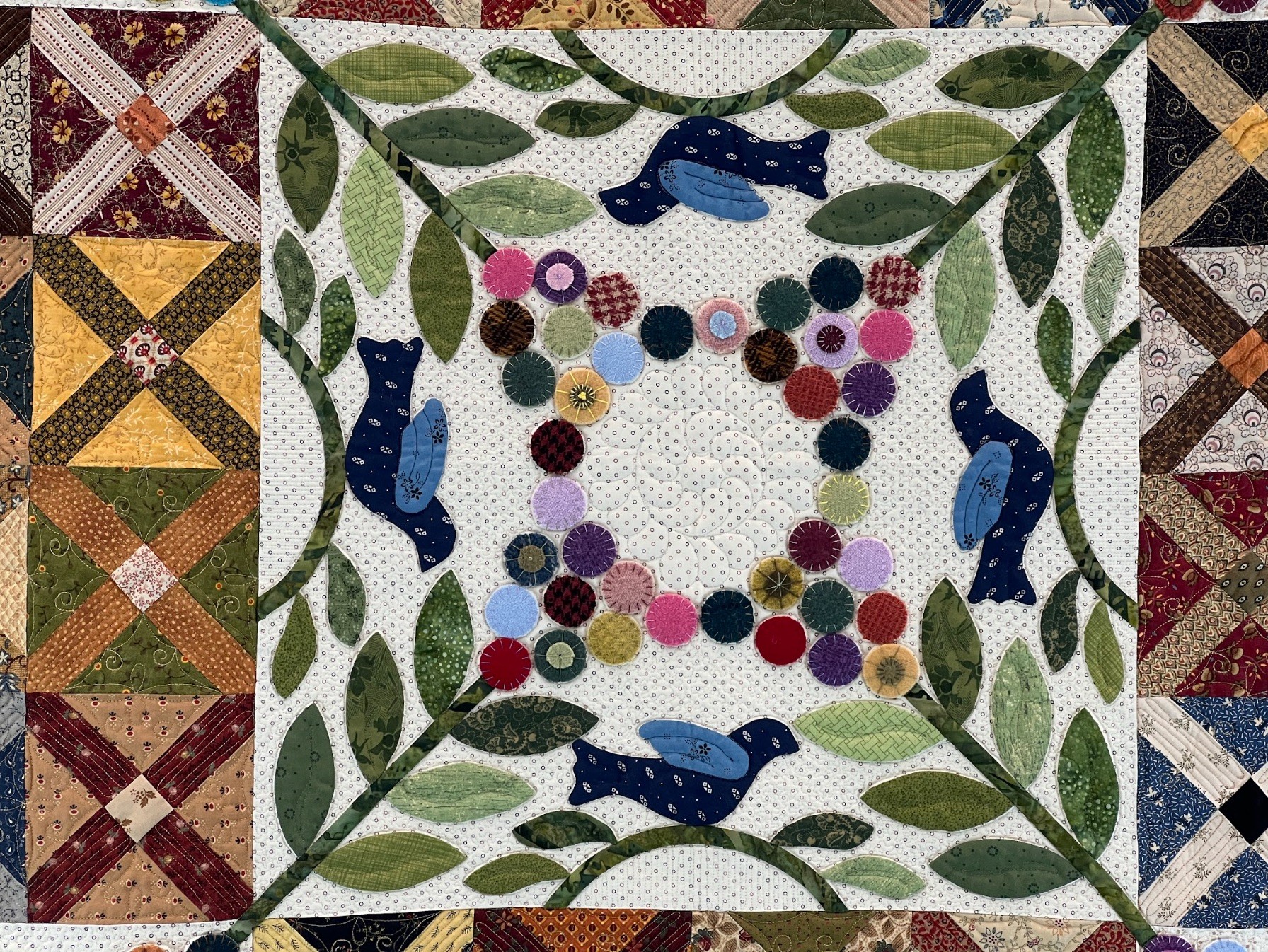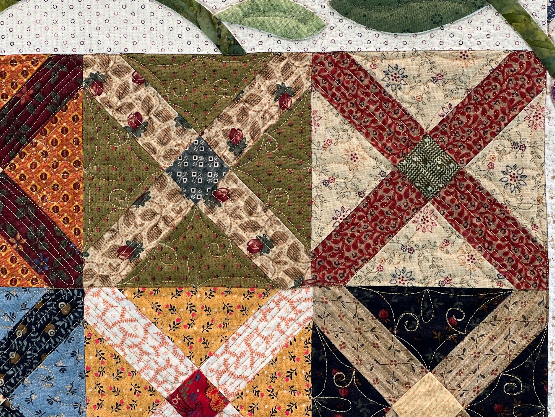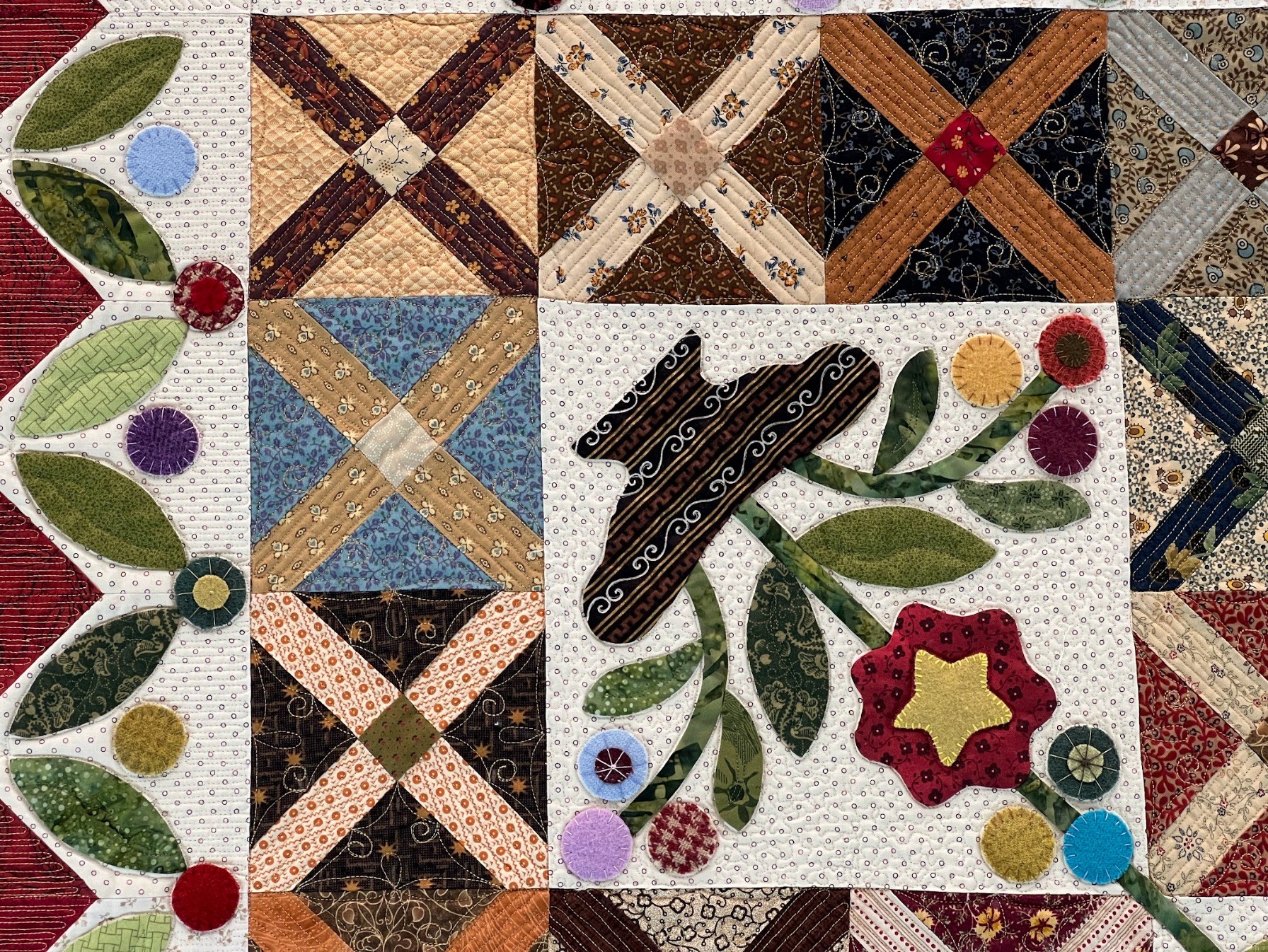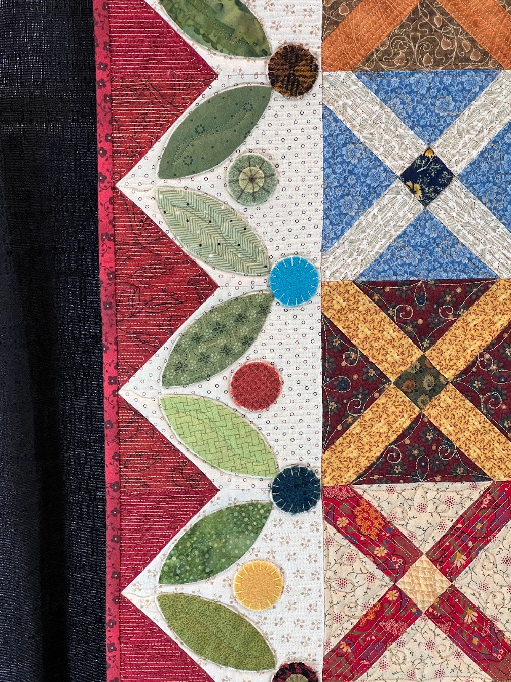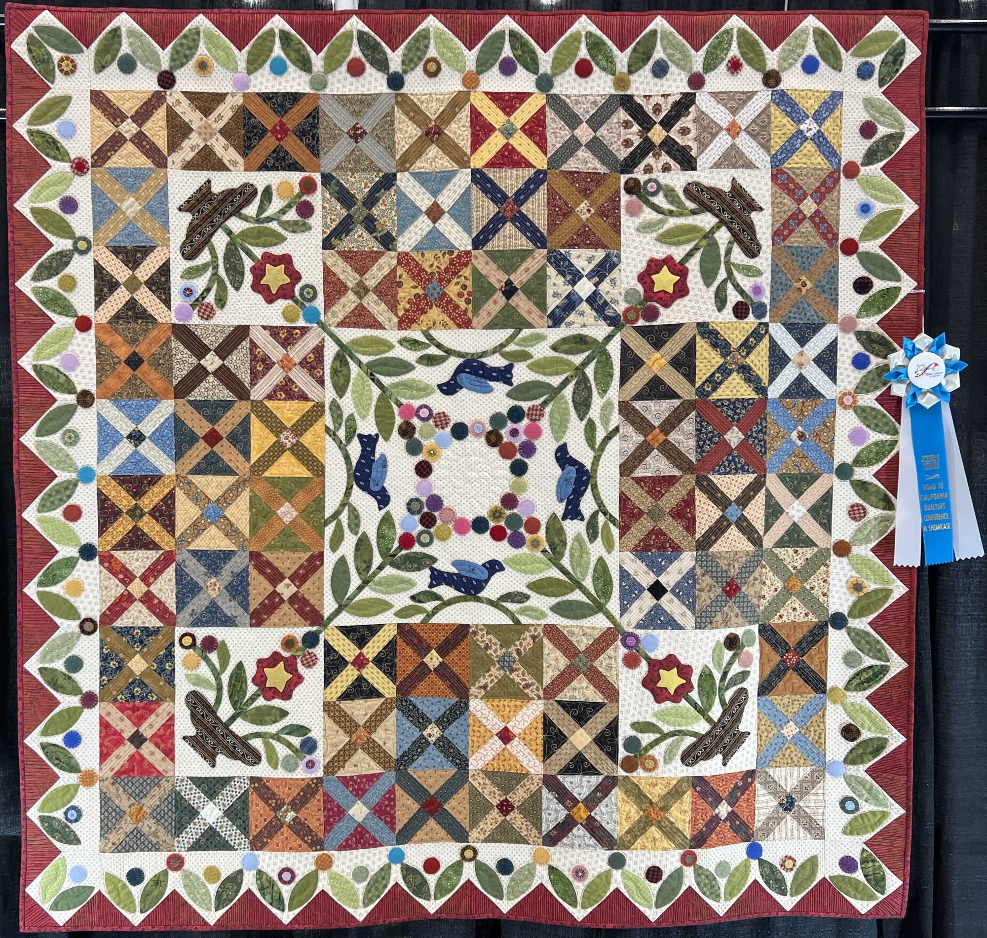 Artist Statement: "Warm Regards is a Kim Diehl and Jo Morton pattern designed for swapping blocks. Blocks were pieced by myself and my friends, Fran and Carol, and we exchanged them. Each of us designed the remainder of our quilts according to our personal tastes. I added wool appliqué in addition to the hand appliqué."