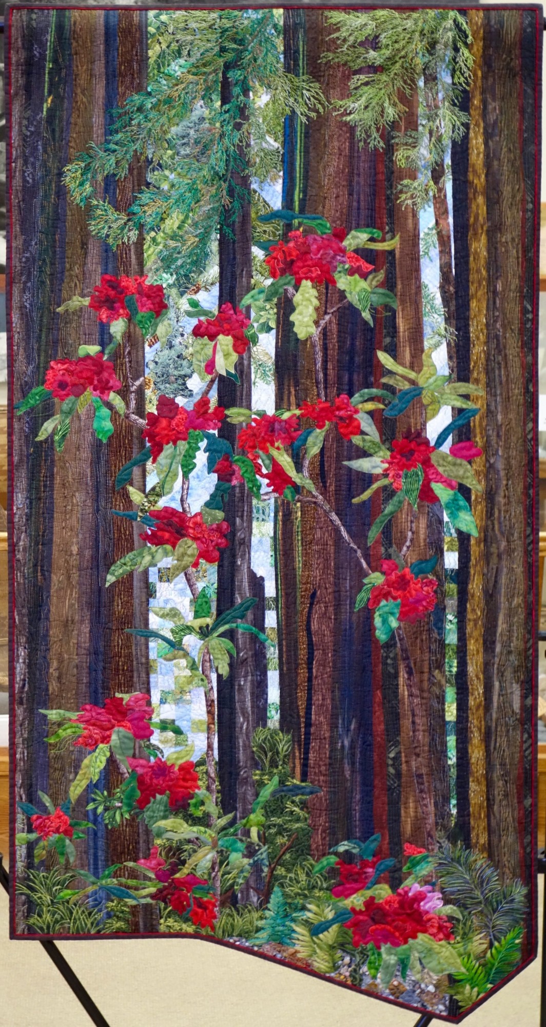 Artist Statement: "Another forest quilt...yes I love them. This time I wanted to capture the sight of rhododendrons along with the redwoods. It required a photo taking excursion. I have a patient husband! The quilt is Mosaic picture pieced with appliqué details. There are also heavy machine embroidery boughs in the trees."