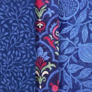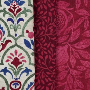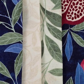 Prints of pomegranate plants in rich wine and navy colors.